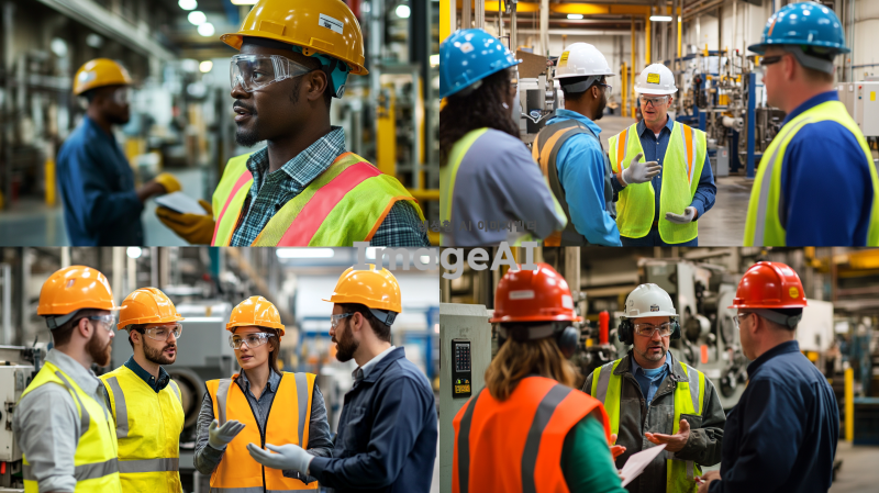 공장 내부에서 작업자들이 안전 보호구를 착용하고 있는 장면, 작업자들은 헬멧, 안전 안경, 귀마개, 장갑, 안전 조끼 등을 착용하고 있으며, 배경에는 기계와 작업 도구들이 보인다. 작업자들은 서로 대화하며 안전 수칙에 대해 배우고 있는 모습, 밝고 안전한 작업 환경, 교육 담당자가 작업자들에게 안전 수칙을 설명하는 장면, 작업자들의 다양한 인종과 성별을 포함하여 포용적인 분위기.