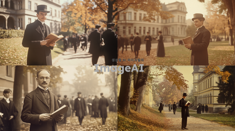 젊은 프리츠 하버가 대학 캠퍼스에서 책을 들고 있는 장면, 19세기 말 독일의 대학 분위기, 고풍스러운 건물과 자연 풍경, 하버의 지적인 표정과 전통적인 학생 복장, 주변에 다른 학생들이 어울려 있는 모습, 가을의 따뜻한 색감과 부드러운 햇빛.