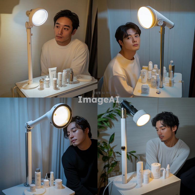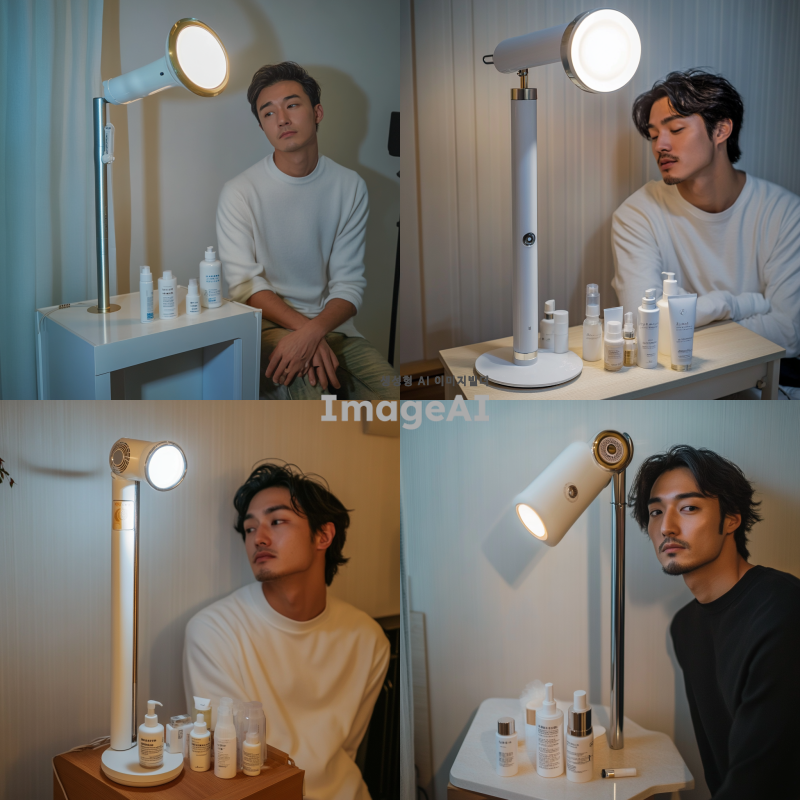 20대 동양인 남성이 밤에 화장대 앞에 앉아 있다. 그는 거치대에 꽂힌 드라이기로 머리를 말리면서 동시에 스킨을 얼굴에 바르고 있다. 화장대 위에는 다양한 스킨케어 제품들이 놓여 있다. 남성의 표정은 편안하고 집중되어 있으며, 그의 머리카락은 바람에 살짝 흩날리고 있다. 주변 배경은 현대적이고 깔끔한 스타일로 꾸며져 있다.