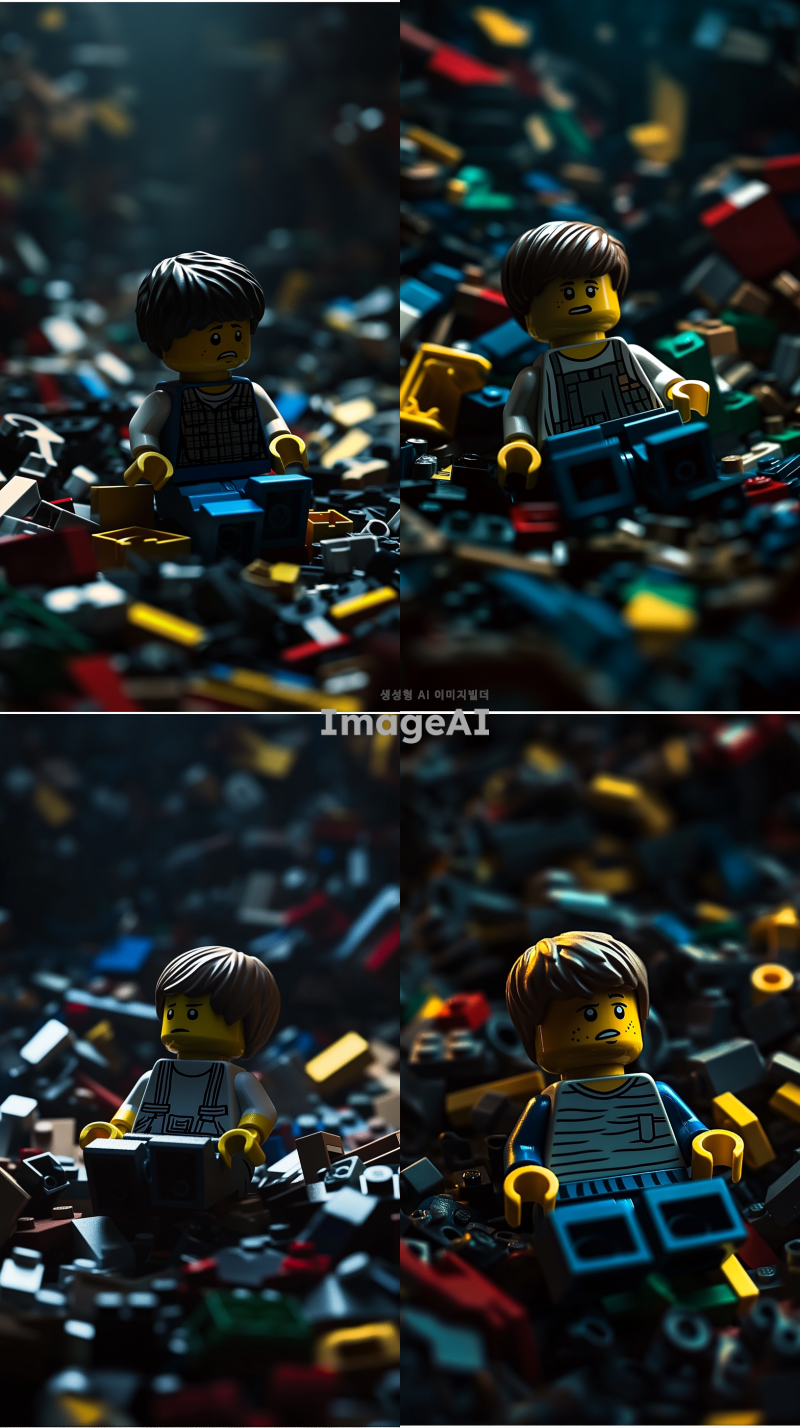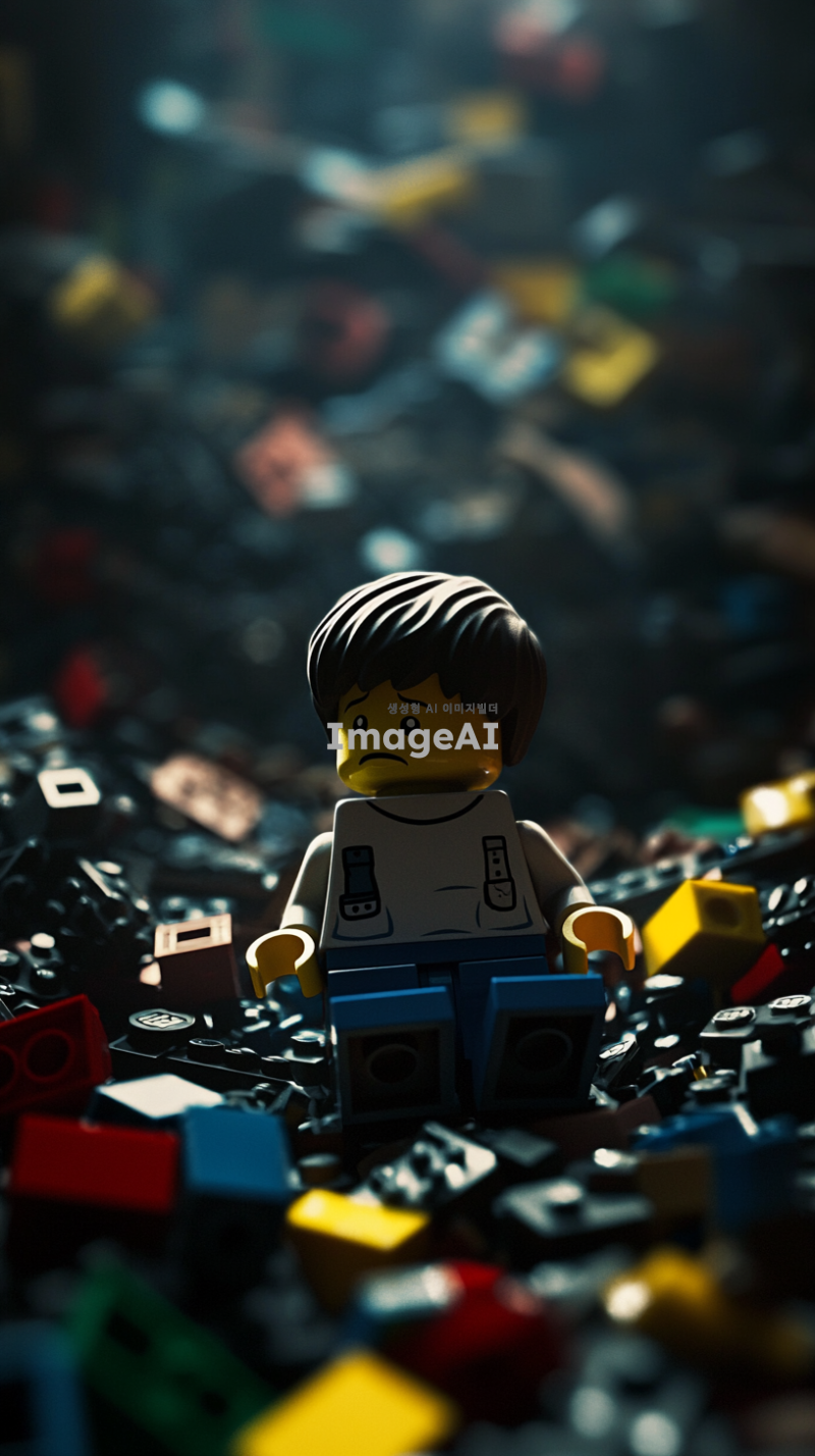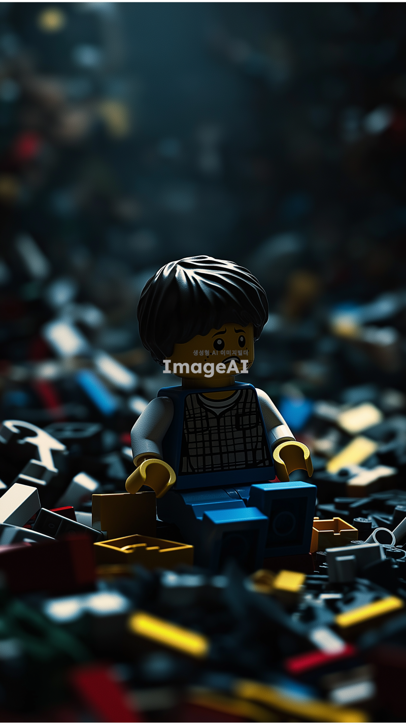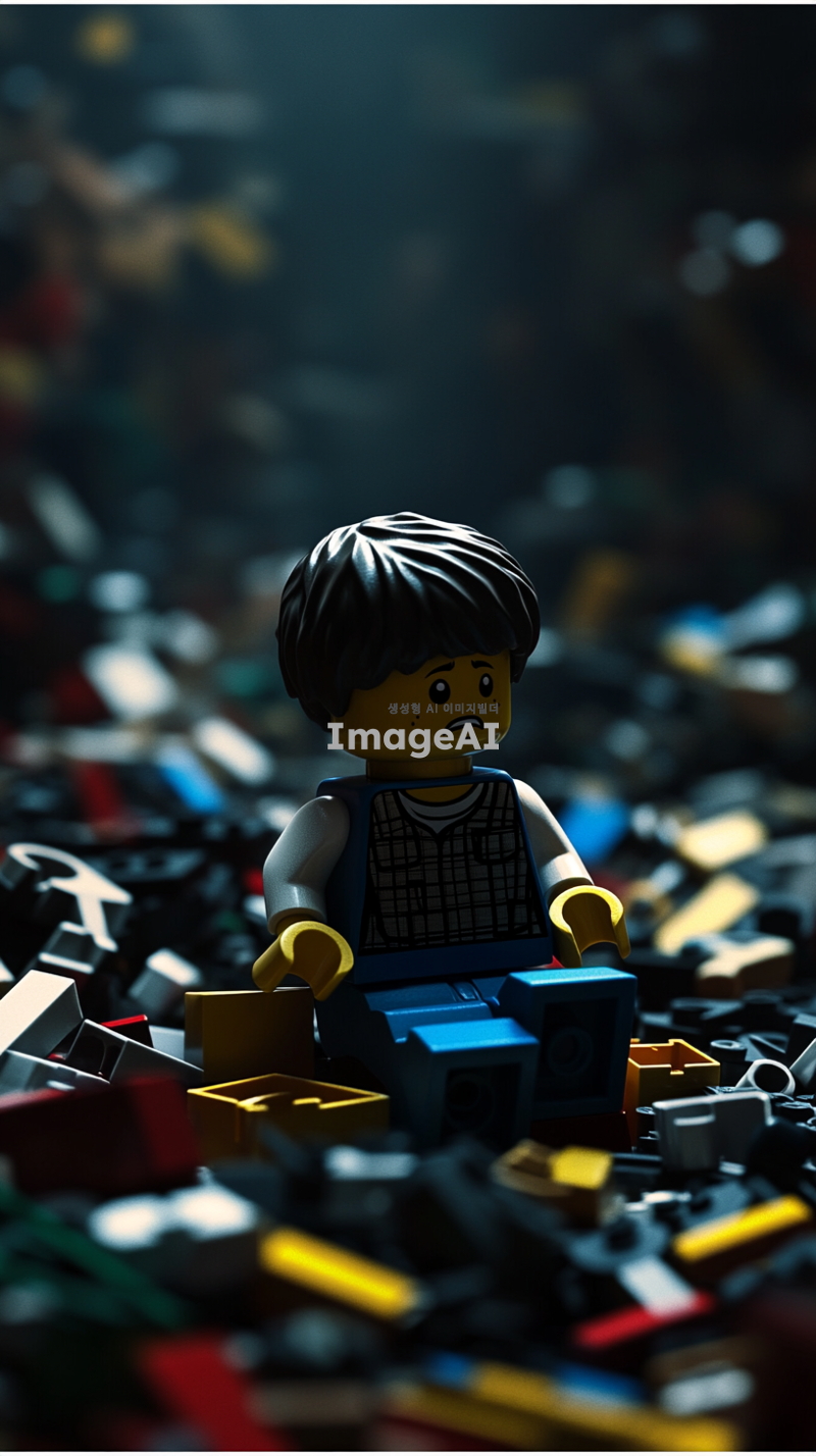 어두운 장면 속 쓰레기더미에 앉아 있는 버려진 아이 레고, 울고 있는 표정, 전체적으로 어두운 분위기, 슬픔이 느껴지는 장면, 레고 특유의 블록 질감과 디테일을 강조