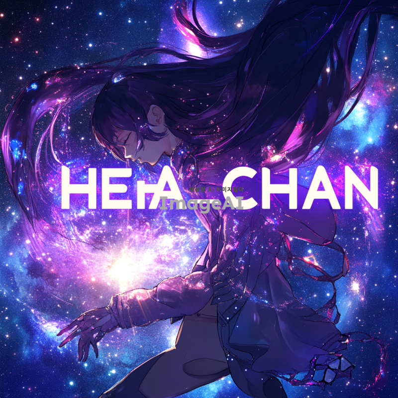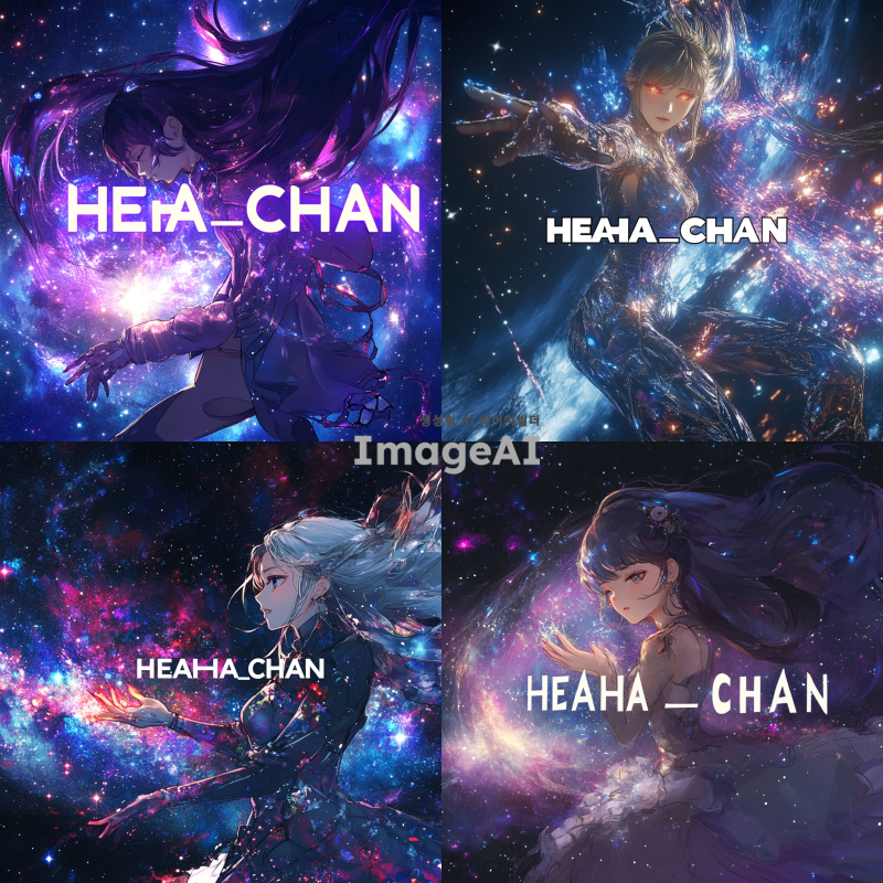우주를 배경으로 한 여자 캐릭터가 마법을 사용하며 싸우는 장면, 우주 공간의 별과 은하가 배경으로 펼쳐져 있으며, 캐릭터는 신비로운 마법 에너지를 손에서 발산하고 있다. 그녀의 옷은 미래지향적인 디자인과 반짝이는 소재로 이루어져 있으며, 머리카락은 무중력 상태에서 부드럽게 흩날린다. 장면 중앙에 "HEAHA_CHAN"이라는 글자가 크고 선명하게 배치되어 있다. 글자는 은하의 빛과 조화를 이루며, 마치 마법의 일부인 듯한 효과를 준다.