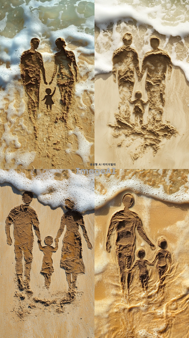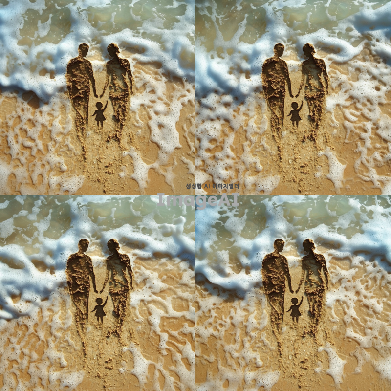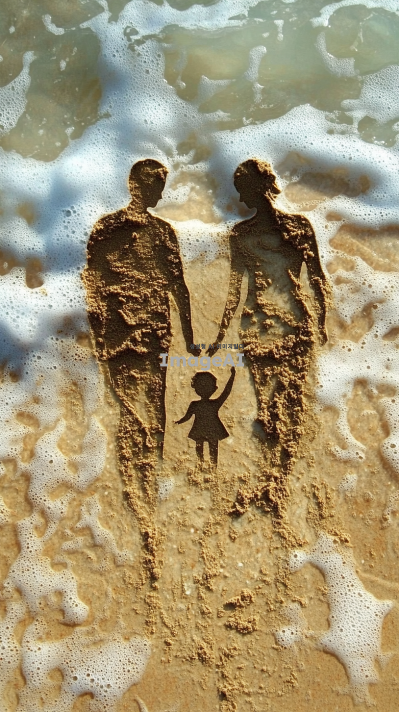 바다 해변 모래로 만든 아빠 엄마 그리고 아이의 모습을 그려줘 근데 파도로 인해 아이모양의 모래가 사라지는 상황도 보였으면 좋겠어