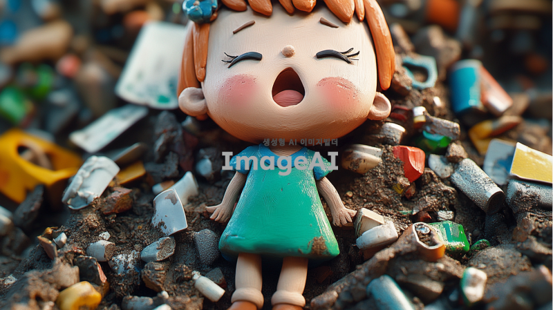 클레이로 만들어진 유치원생이 쓰레기더미 위에 올려져 있는 모습을 만들어줘. 표정은 우는 표정이였으면 좋겠고 캐릭터화 시켜서 만들어줘.