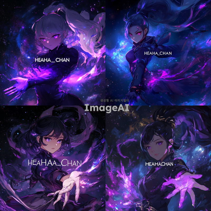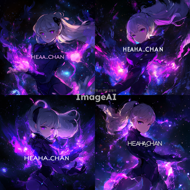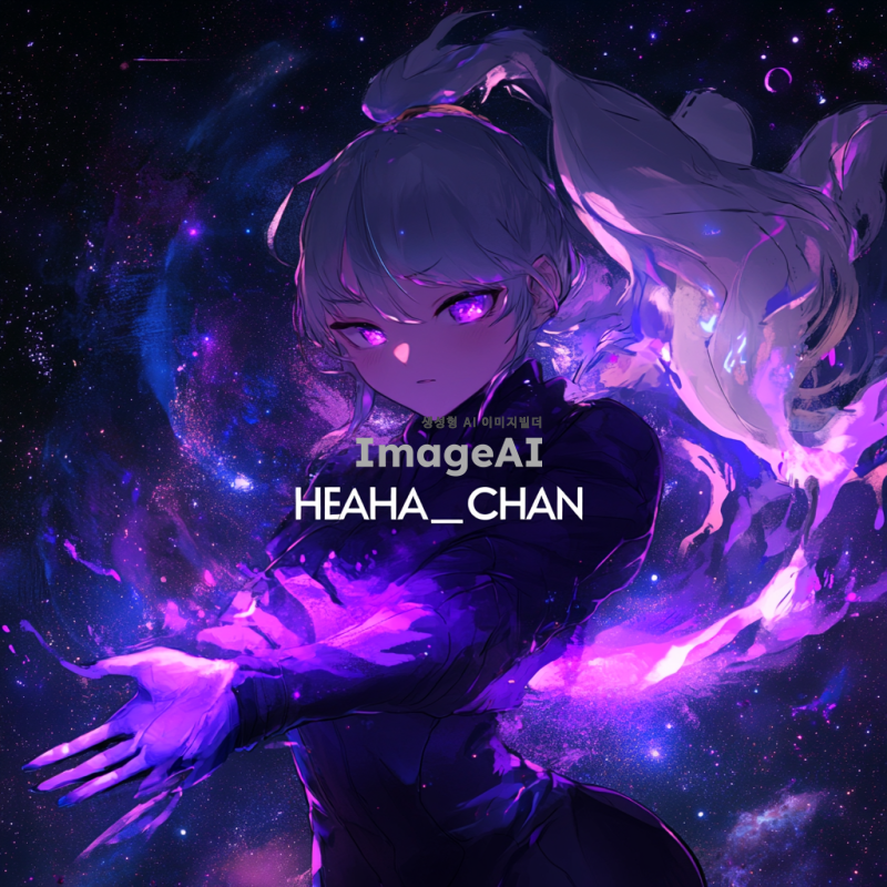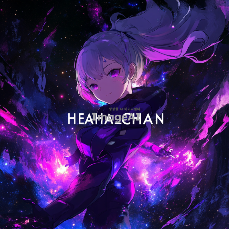 우주를 배경으로 보라색 마법을 사용하는 여성 캐릭터가 전투를 벌이는 장면, 중앙에 "HEAHA_CHAN"이라는 글씨가 멋진 서체로 크게 배치된 이미지. 캐릭터는 미래적인 복장을 하고 있으며, 주변에는 반짝이는 별과 은하가 어우러져 신비로운 분위기를 연출. 보라색 마법은 빛나는 에너지 형태로 표현되어 캐릭터의 손에서 발산되고, 우주의 깊이를 강조하기 위해 어두운 배경과 대조되어 시각적 임팩트를 강화.