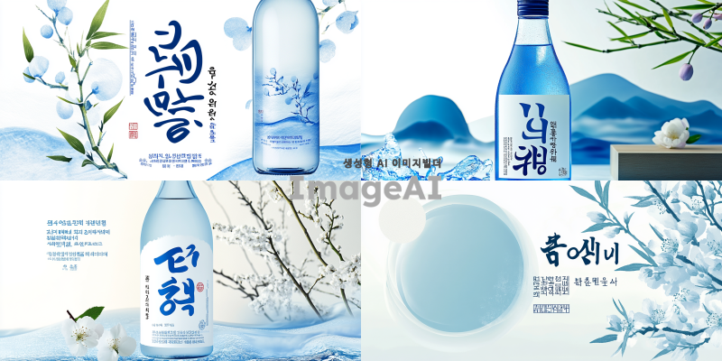 전통적인 한국의 미를 담은 소주 라벨 디자인, 푸른색과 흰색의 조화를 이루며, 은은한 대나무와 매화꽃의 패턴이 배경에 깔려 있고, 중앙에는 고급스러운 서체로 '소주'라는 글자가 쓰여 있으며, 자연의 순수함과 청량함을 표현하는 이미지.