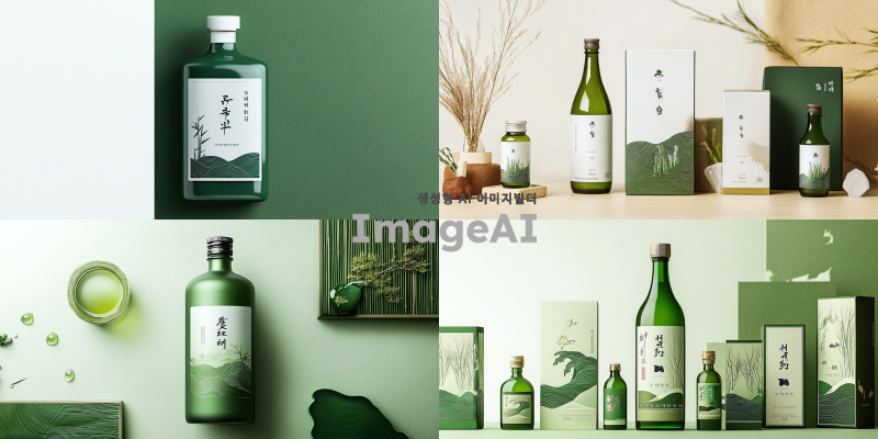 전통적인 한국 소주 라벨 디자인, 풀색과 백색의 색채 조화, 한국 전통 문양과 현대적인 타이포그래피의 조화, 자연을 상징하는 대나무와 물결 무늬, 깔끔하고 세련된 레이아웃, 브랜드 이름이 중앙에 강조된 디자인, 고급스러운 느낌을 주는 은은한 광택 효과, 한국 전통 미학을 현대적으로 재해석한 스타일.