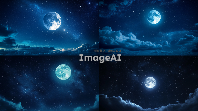 어두운 밤 하늘, 수많은 별들이 쏟아질 듯이 빛나고 있는 장면, 중앙에 환하게 빛나는 보름달, 은은한 달빛이 주변을 비추며 몽환적인 분위기를 연출, 하늘은 깊고 짙은 남색, 별들은 다채로운 색상으로 반짝이며 신비로운 느낌, 달 주변에는 옅은 구름이 부드럽게 흘러가는 모습, 전체적으로 차분하고 평화로운 분위기