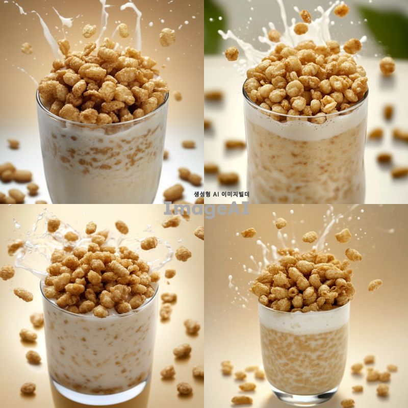 투명한 유리잔에 담긴 크리미한 쉐이크, 위에는 고소한 현미 크런치와 콘플레이크, 다양한 크기의 곡물 알갱이가 공중에서 튀어오르는 순간을 포착한 이미지, 황금빛 갈색의 바삭한 질감이 돋보이는 현미 크런치, 배경에는 흰색두유가 튀기는 모습이 함께, 밝고 식욕을 돋우는 따뜻한 색감의 조명. 쉐이크와 현미 크런치의 디테일이 강조되도록 조명이 설정되어있다.