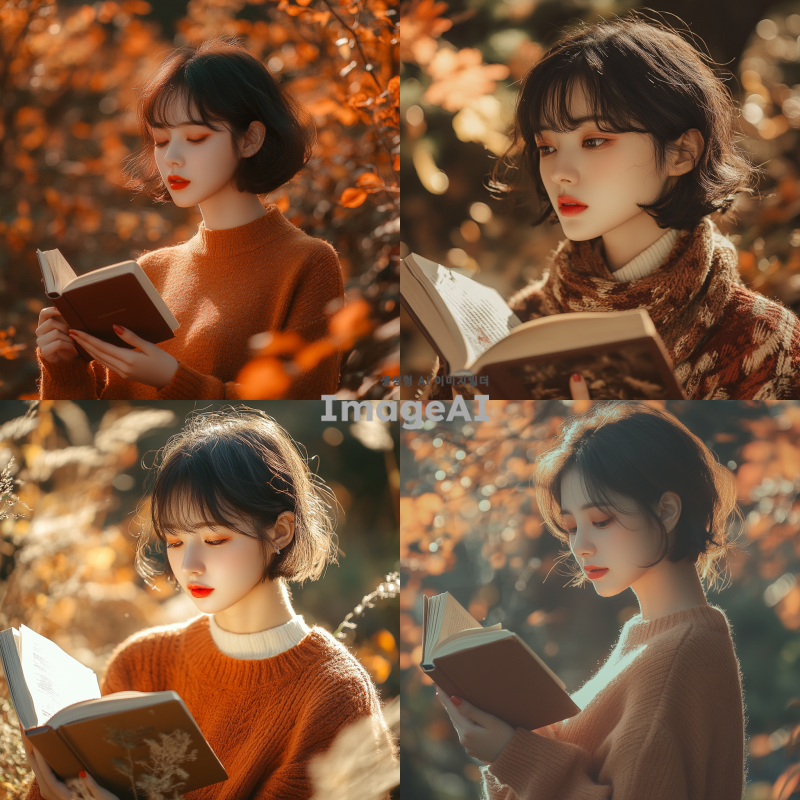 20대 후반 단발머리 여성, 쌍꺼풀 있는 눈과 빨간 입술, 가을 분위기에 어울리는 따뜻한 색상의 옷을 입고, 책을 읽고 있는 모습, 주변에는 가을 풍경이 펼쳐져 있고, 부드러운 햇살이 비치는 장면, 자연스러운 포즈와 편안한 표정.