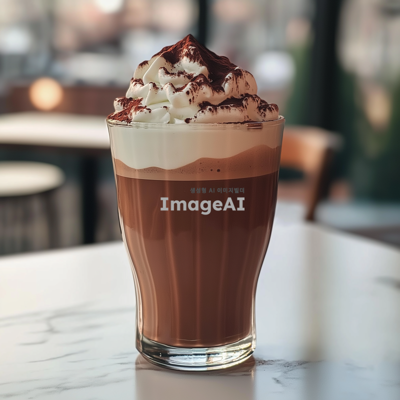 투명한 유리잔에 담긴 초콜릿라떼, 부드럽고 진한 초콜릿 색상이 돋보이며, 잔 위에는 부드럽고 풍성한 하얀 크림이 얹혀져 있다. 크림 위에는 살짝 갈색의 초콜릿 가루가 뿌려져 있으며, 주변에는 따뜻하고 아늑한 분위기를 연출하는 조명이 비치고 있다. 배경은 카페 내부의 아늑한 느낌으로, 흰색 테이블 위에 놓여 있는 모습.