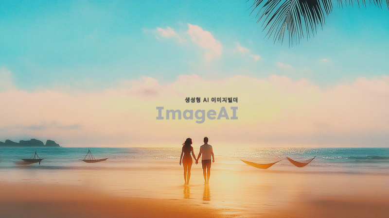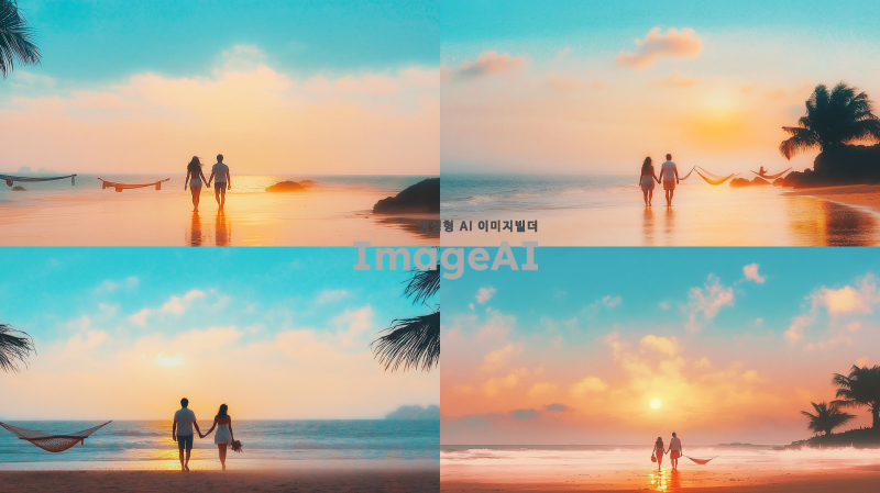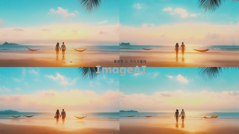 석양이 지는 해변에서 손을 잡고 걸어가는 커플, 주변에는 야자수 나무가 늘어서 있고 해먹이 걸려 있는 모습, 따뜻한 색감과 부드러운 분위기, 바다의 잔잔한 파도 소리와 함께 평화로운 장면.