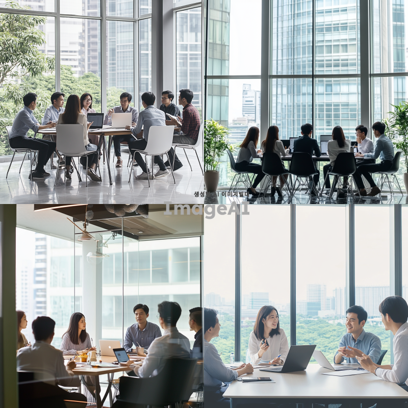 동양인 비즈니스 회의, 현대적이고 세련된 사무실 환경, 다양한 연령대와 성별의 사람들이 테이블에 둘러앉아 토론 중, 창의적인 아이디어를 공유하는 모습, 자연광이 들어오는 넓은 창문, 깔끔하고 전문적인 분위기, 스마트폰과 노트북 사용, 협력과 혁신을 강조하는 장면.