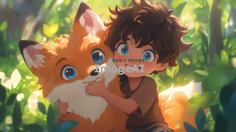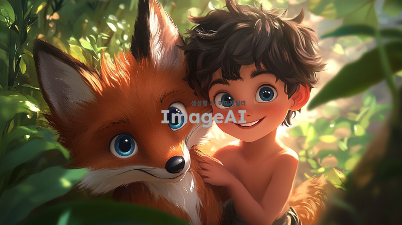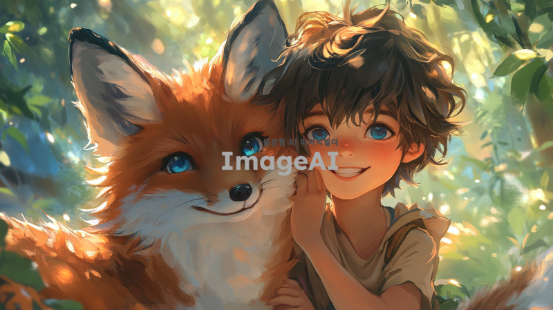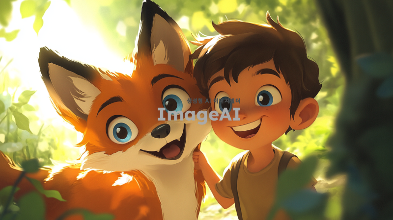 귀여운 여우와 남자아이의 조화로운 캐릭터 디자인, 여우는 부드러운 갈색 털과 생생한 푸른 눈을 가지고 있으며, 남자아이는 밝은 미소와 짙은 갈색 머리카락을 가진 모습, 둘은 함께 모험을 떠나는 듯한 포즈, 주변에는 푸른 숲과 따뜻한 햇살이 비치는 배경, 동화적인 분위기 강조, 생동감 있고 친근한 느낌.
