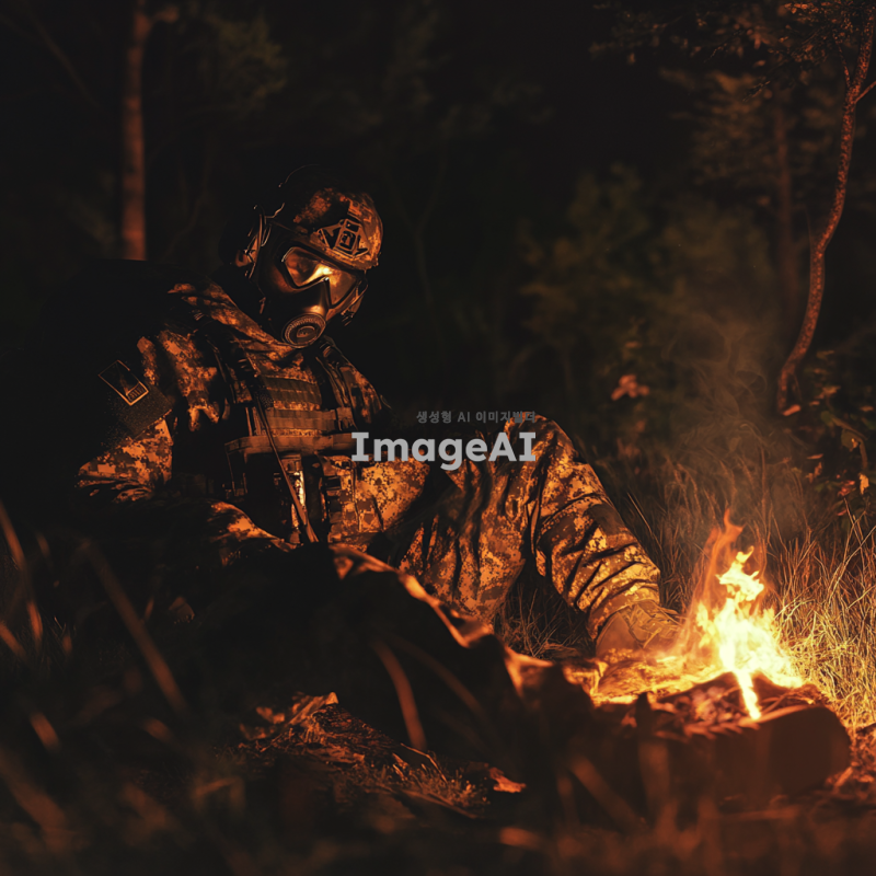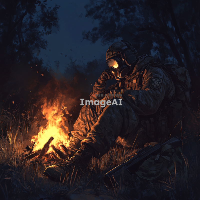 방독면을 쓴 군인이 군복을 입고 총을 옆에 두고 모닥불 앞에 앉아 쉬고 있는 모습, 어두운 밤 배경, 불빛에 비치는 군인의 자세한 디테일, 주변에 나무와 풀로 이루어진 자연 환경, 따뜻하고 고요한 분위기.