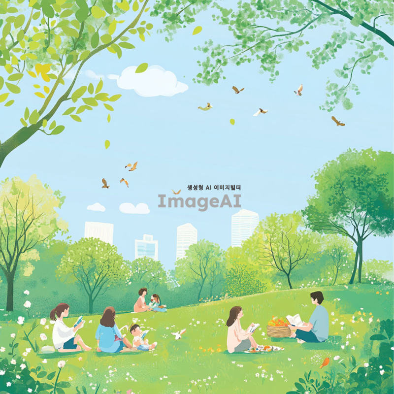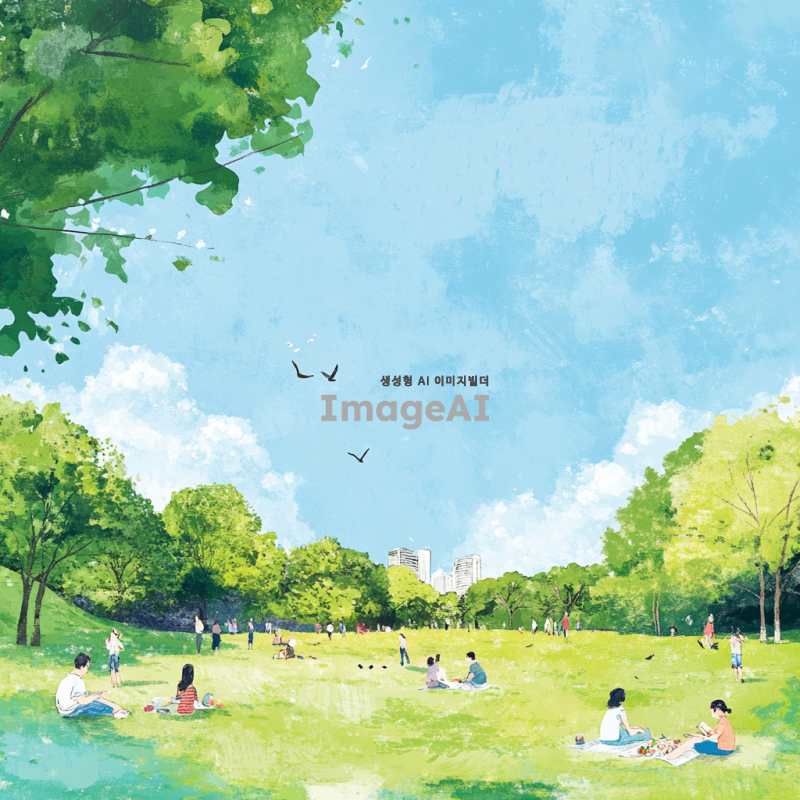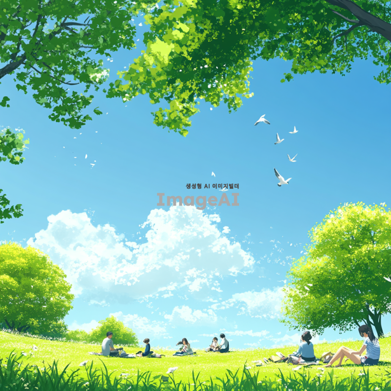 햇살이 밝게 내리쬐는 푸른 하늘 아래, 초록빛 가득한 공원에서 사람들이 여유롭게 산책을 즐기고 있는 모습. 나무 그늘 아래에서 책을 읽거나, 잔디밭에 앉아 피크닉을 즐기는 가족들, 그리고 하늘을 나는 새들이 평화롭고 활기찬 분위기를 더하고 있는 장면.