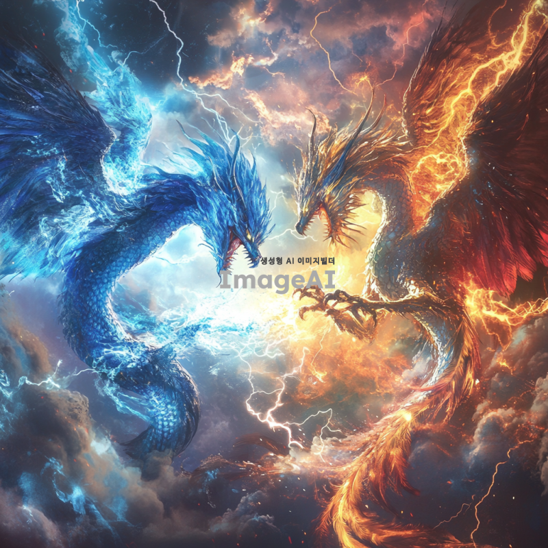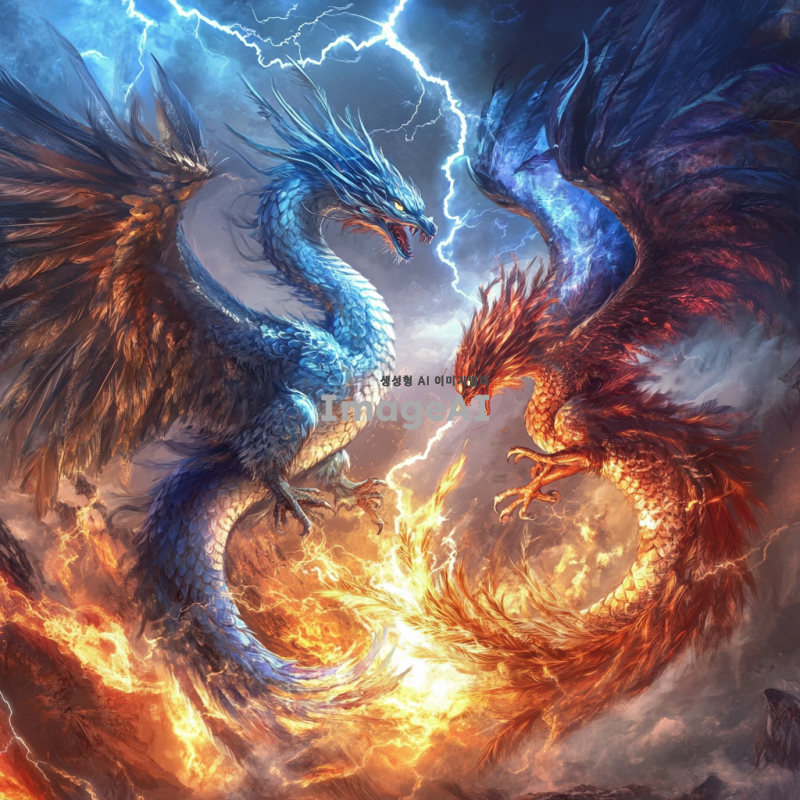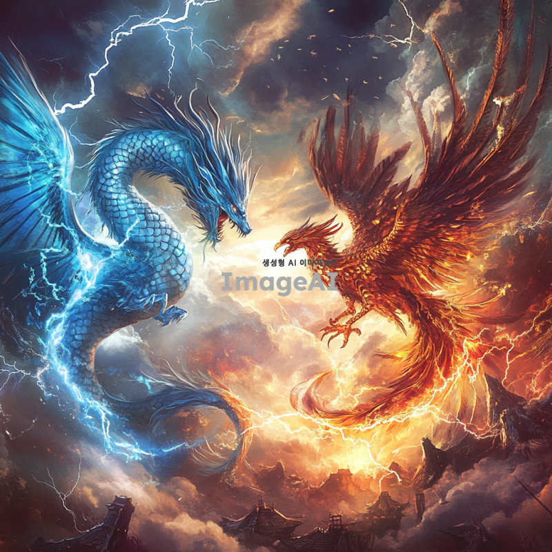 웅장하고 신비로운 배경 위에 용과 봉황이 치열하게 싸우고 있는 장면, 용은 푸른 비늘과 날카로운 발톱을 가진 강력한 모습, 봉황은 화려한 깃털과 날개를 펼친 우아한 모습, 하늘에는 번개와 구름이 어우러져 긴장감 넘치는 분위기, 두 존재가 서로를 향해 강력한 에너지를 발산하는 순간, 전통적인 동양 미술 스타일로 표현된 이미지.