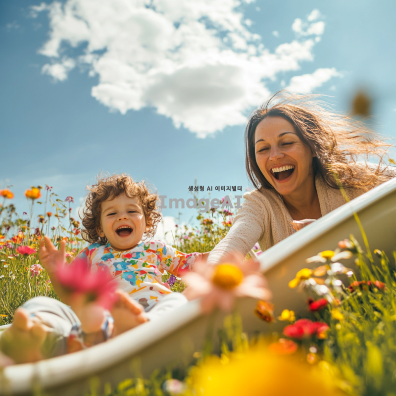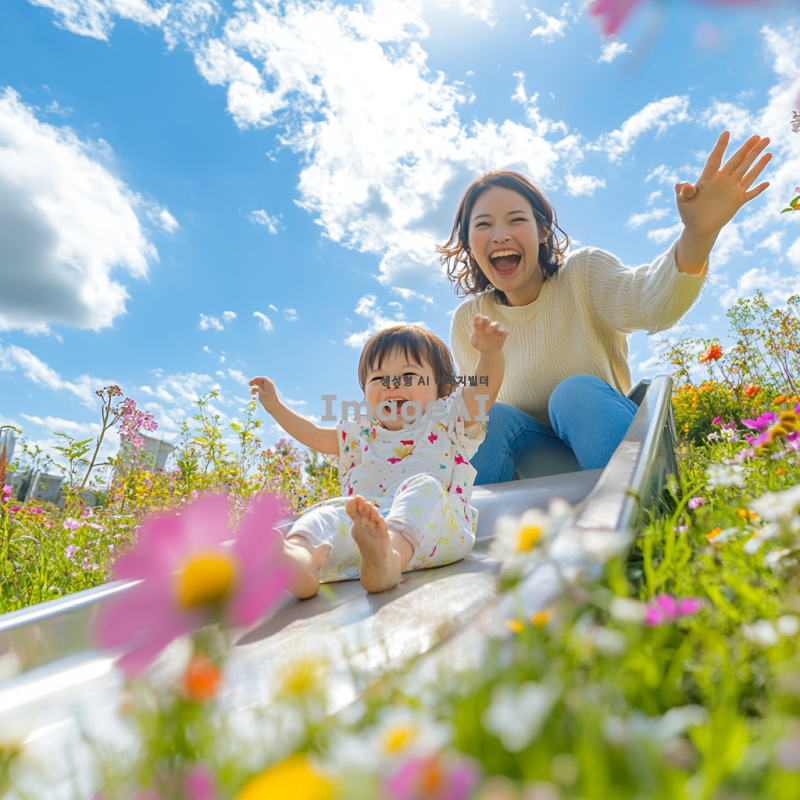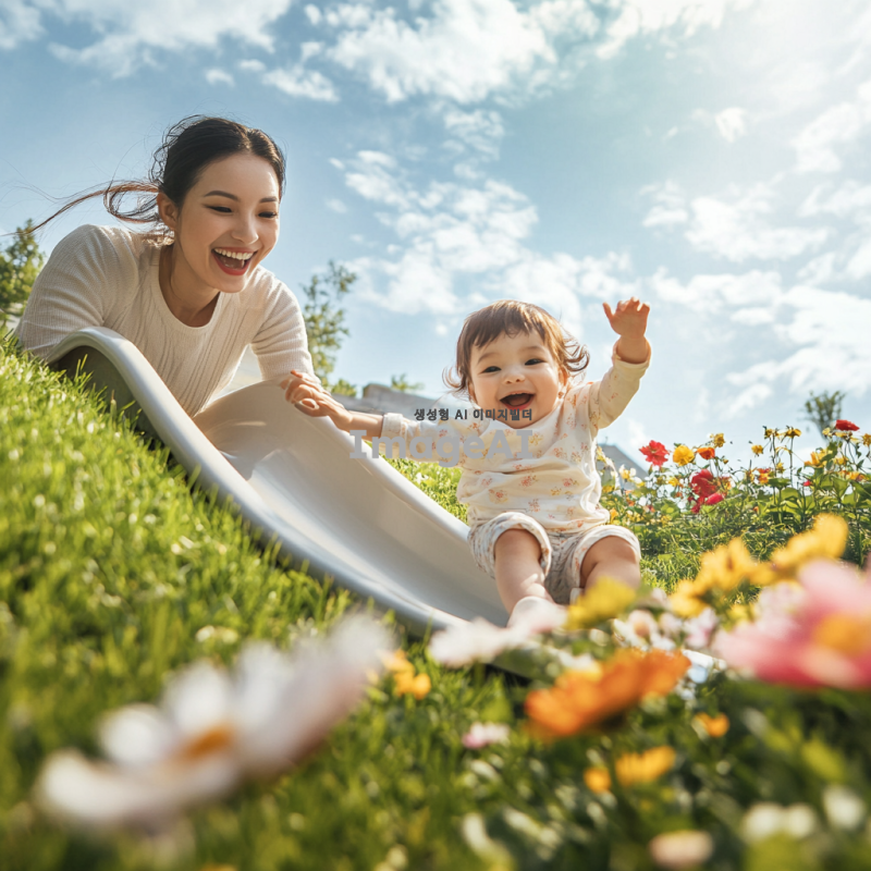 밝은 햇살 아래 공원에서 아이와 함께 즐겁게 놀고 있는 엄마, 아이는 미끄럼틀을 타고 있고 엄마는 환하게 웃으며 응원하고 있음. 주변에는 푸른 잔디와 다양한 색상의 꽃들이 피어 있으며, 하늘에는 몇 개의 흰 구름이 떠 있음. 아이와 엄마 모두 캐주얼한 옷차림으로 편안하고 행복한 분위기.