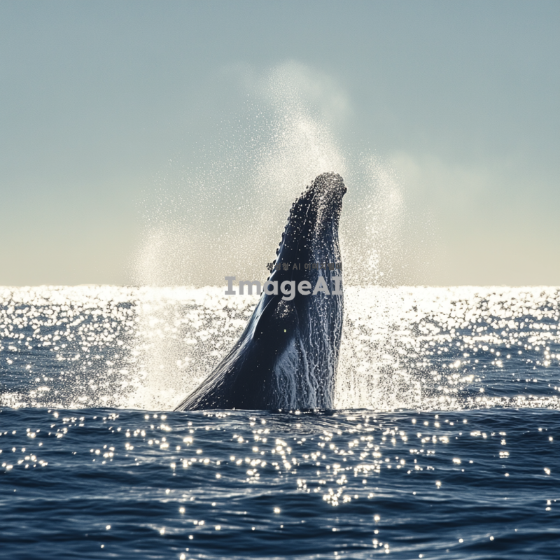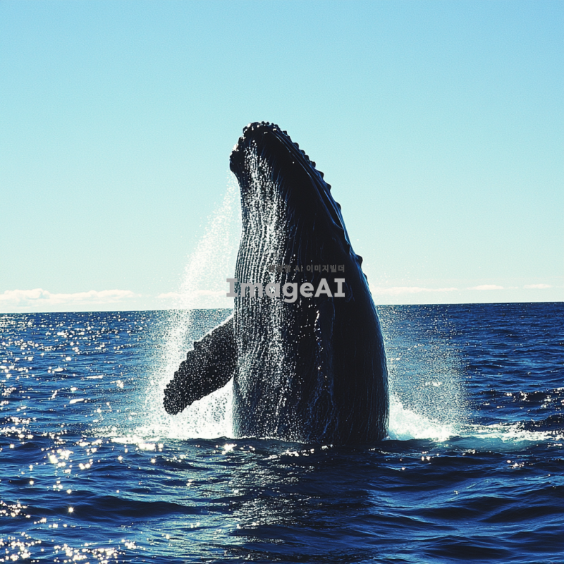거대한 고래가 해수면 위로 물을 뿜으며 힘차게 솟아오르는 장면, 태양빛이 물방울에 반사되어 반짝이는 효과, 주변에 펼쳐진 푸른 바다와 맑은 하늘, 고래의 생동감 있는 움직임과 물의 역동적인 흐름을 강조, 자연의 웅장함과 아름다움을 표현