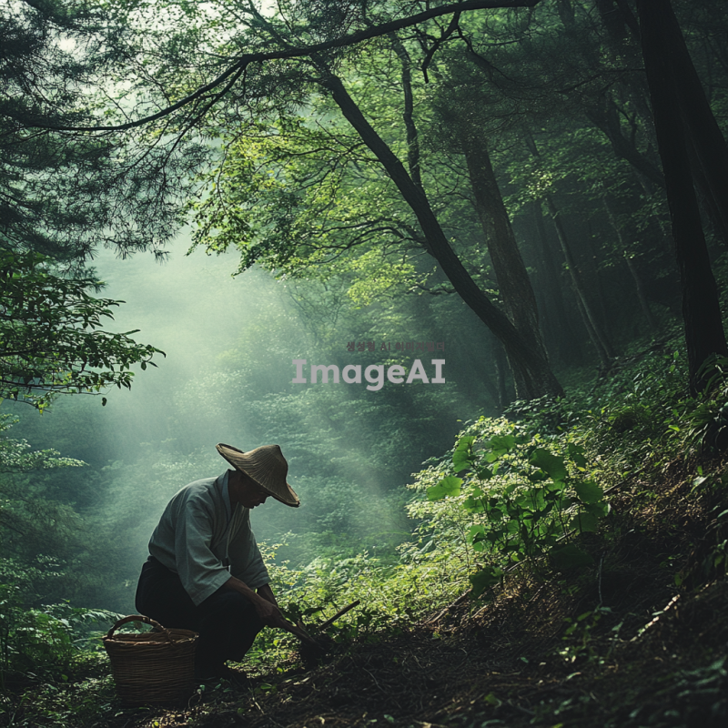 깊은 산속에서 산삼을 캐는 전통적인 복장의 한국인 남성, 주변은 울창한 숲과 안개로 가득 차 있으며, 이른 아침의 부드러운 햇살이 나무 사이로 비치는 장면, 남성은 집중하며 손으로 흙을 파고 있으며, 그의 옆에는 작은 바구니와 도구들이 놓여 있다, 자연과 조화를 이루는 고요하고 신비로운 분위기.
