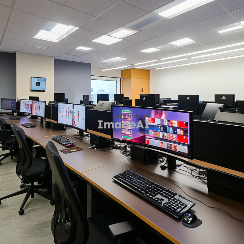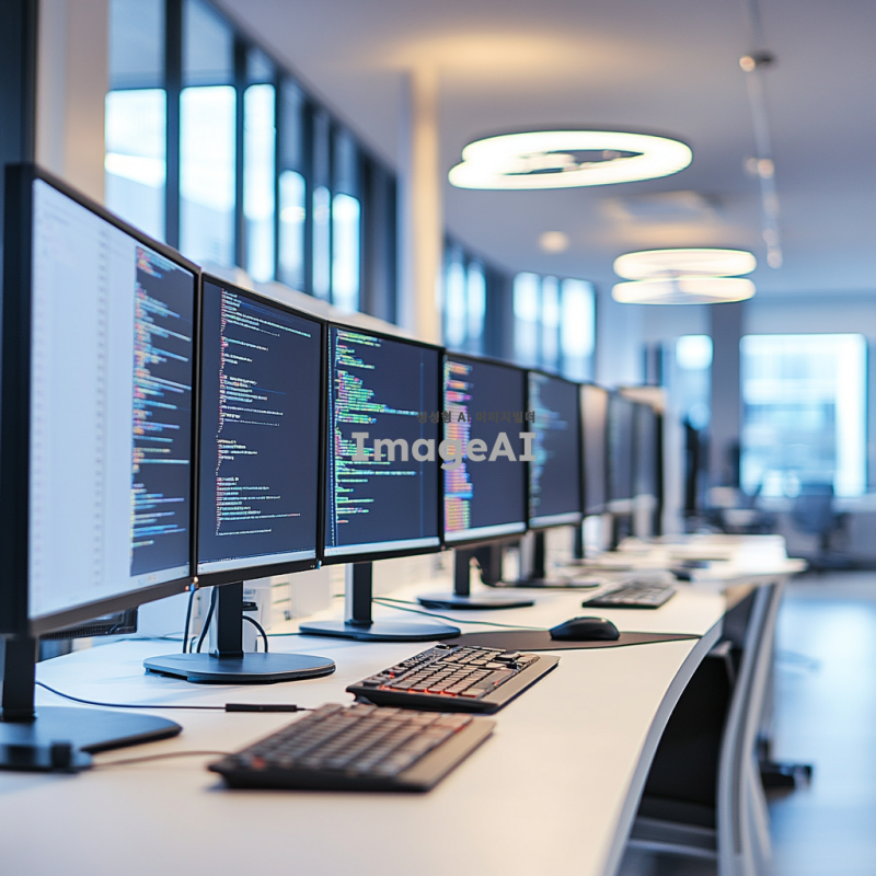 최신형 컴퓨터 여러 대가 나란히 놓여 있는 모습, 각각의 컴퓨터는 고해상도 모니터와 LED 조명이 장착되어 있으며, 깔끔하고 현대적인 디자인의 책상 위에 배치, 주변에는 다양한 컴퓨터 주변기기와 액세서리가 정돈되어 있는 사무실 환경, 조명은 밝고 선명하게 표현, 각 컴퓨터의 화면에는 서로 다른 소프트웨어나 그래픽이 실행 중인 모습, 전체적으로 정리된 느낌의 현대적인 사무실 공간.