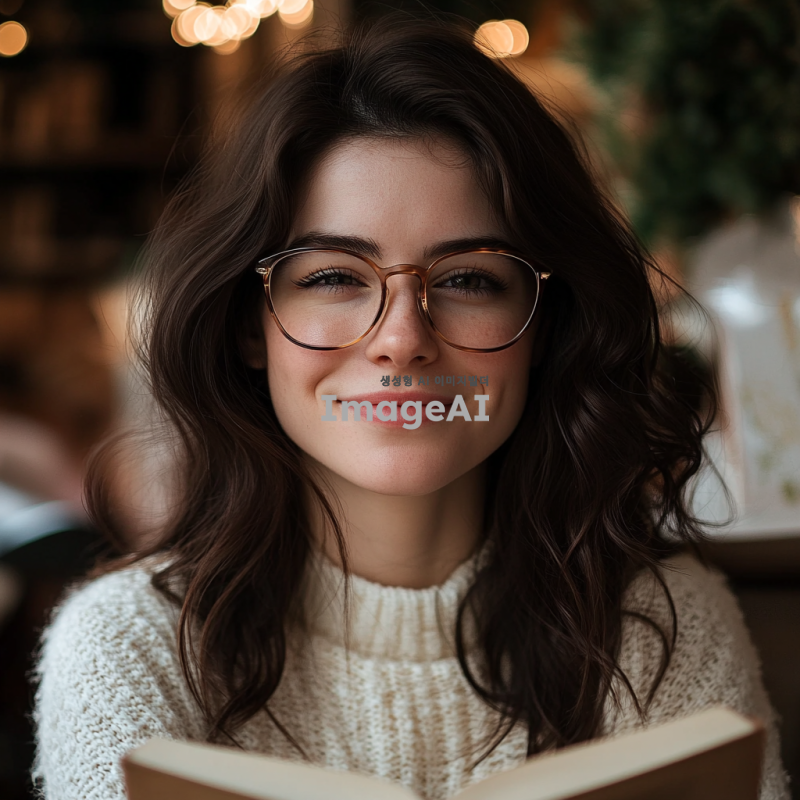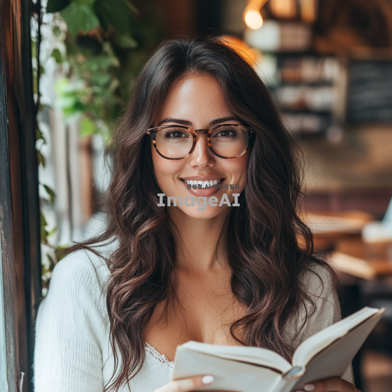 20대 초반의 여성, 지적이고 우아한 분위기, 짙은 갈색 머리카락, 자연스러운 웨이브 스타일, 세련된 디자인의 안경, 따뜻한 미소, 아늑한 카페 배경, 창문을 통해 들어오는 부드러운 자연광, 캐주얼하지만 세련된 복장, 책을 들고 있는 모습.