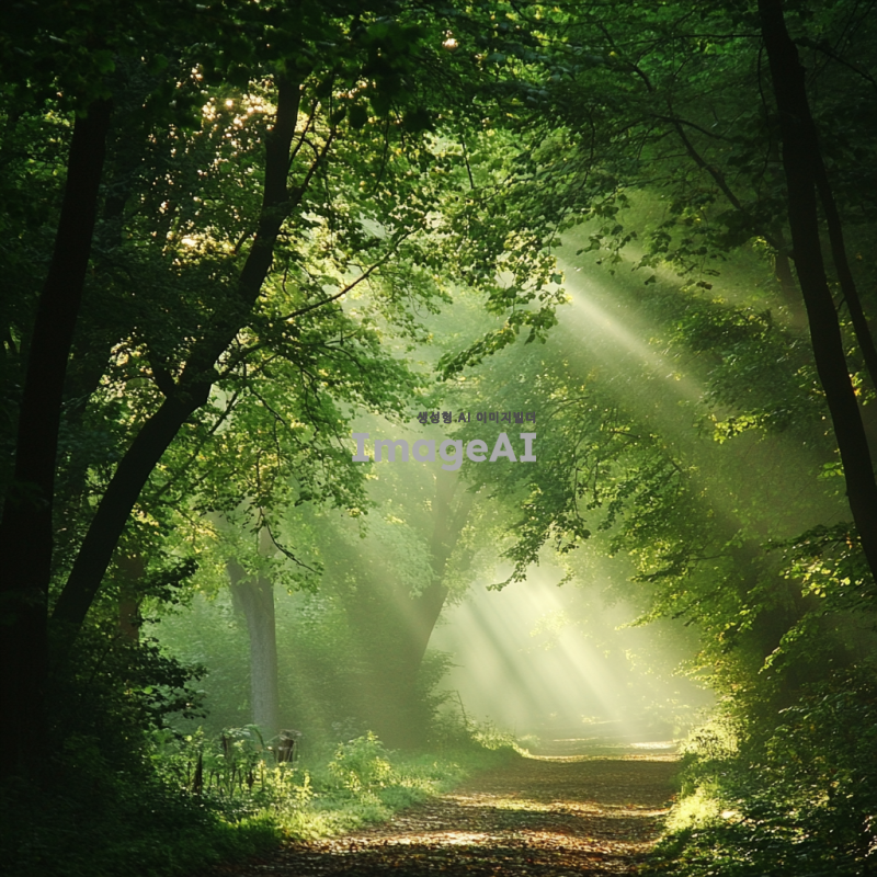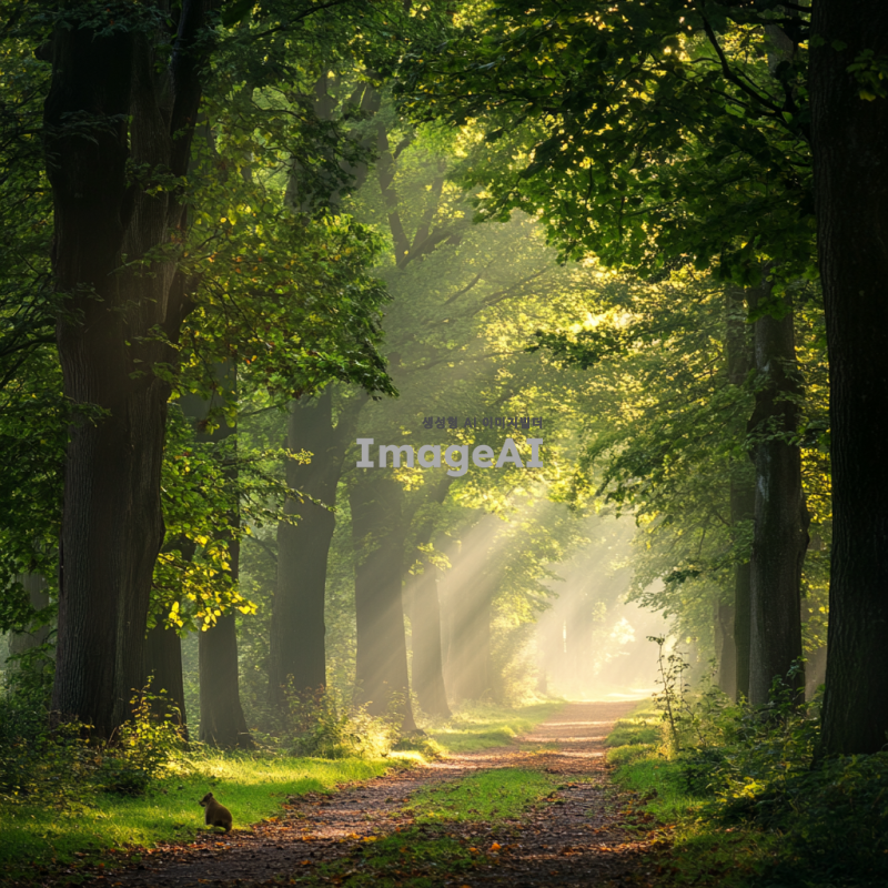 고요한 숲속의 아침 풍경, 안개가 살짝 낀 나무들 사이로 부드러운 햇살이 비치고, 다양한 녹색의 잎사귀들이 바람에 살랑거리는 모습, 작은 동물들이 평화롭게 활동하는 장면, 자연의 소리와 신선한 공기가 느껴지는 분위기, 숲길을 따라 이어지는 나무 터널, 생동감 넘치는 자연의 아름다움.