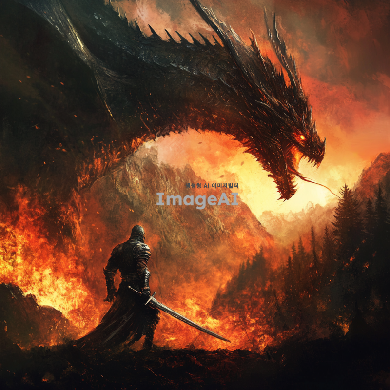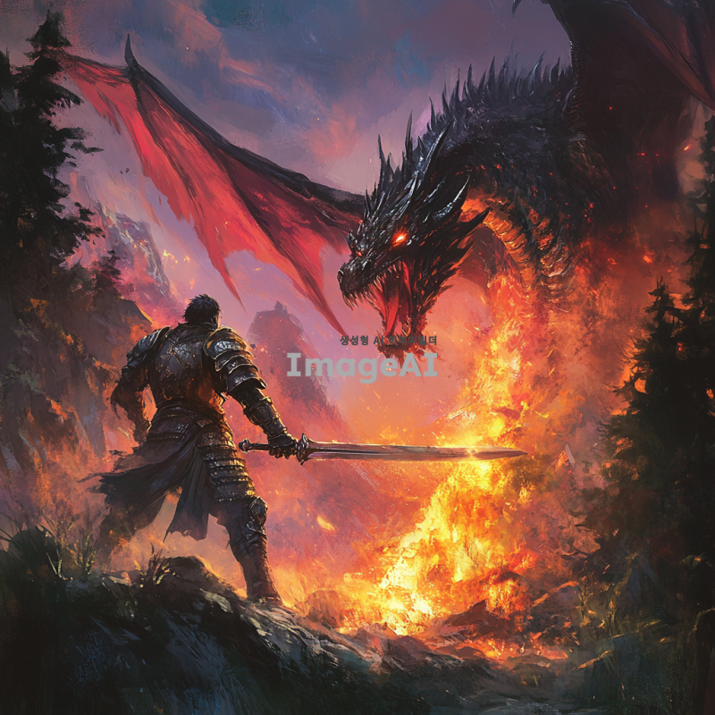 고대의 전사가 거대한 용과 전투를 벌이는 장면, 전사는 빛나는 갑옷을 입고 있으며 손에는 강력한 검을 쥐고 있다. 용은 불길을 뿜으며 하늘을 날고 있고, 주변은 불타오르는 숲과 산으로 둘러싸여 있다. 전사의 얼굴은 결연한 의지로 가득 차 있고, 용의 눈은 붉게 빛난다. 배경은 황혼의 하늘로, 붉은 노을이 전장의 긴장감을 더해준다. 전사의 갑옷은 세부 디테일이 정교하게 표현되어 있으며, 용의 비늘은 빛을 반사하여 은은하게 빛난다.