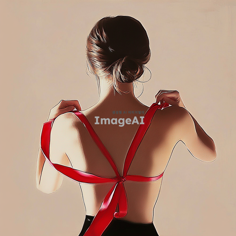 빨간색 리본 우아하게 묶는 모습 뒷모습 여성, 묶은머리, 자연광이 은은하게 비치는 배경, 따뜻하고 포근한 분위기, 고급스러운 느낌 강조.