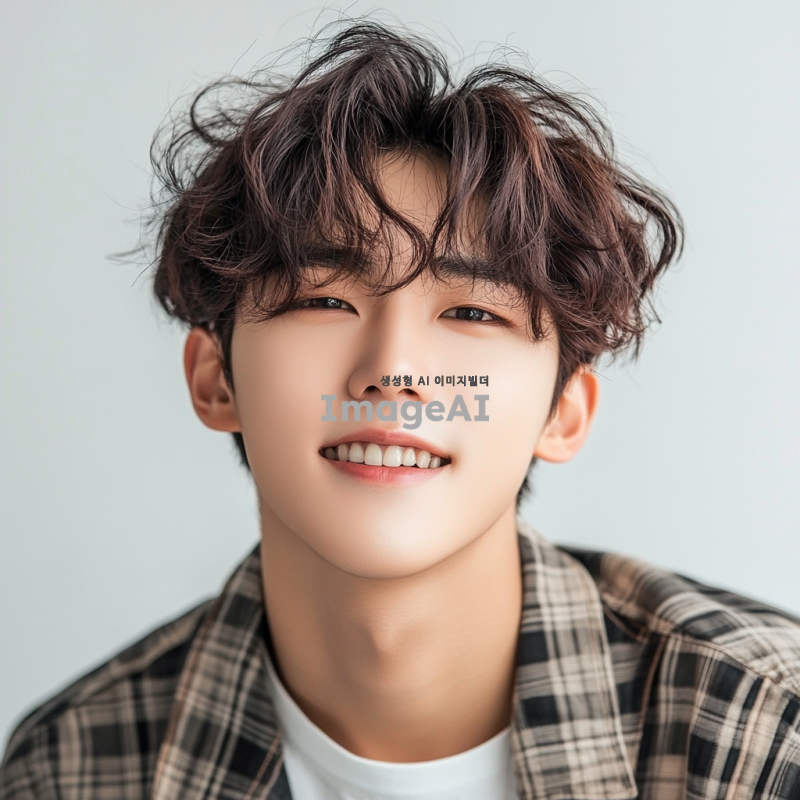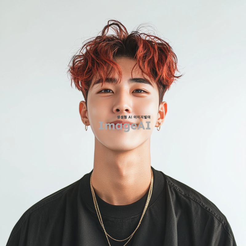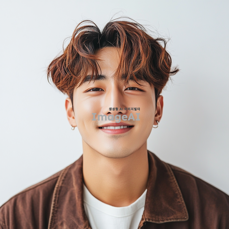 한국 남성의 현대적인 헤어스타일, 다양한 길이와 색상, 자연스러운 웨이브와 볼륨감이 강조된 세련된 앞머리 스타일, 트렌디한 염색 스타일을 가진 인물, 도시적인 분위기를 연출하며 패션 잡지 화보 느낌을 주는 이미지, 밝은 조명 아래에서 촬영된 장면, 미소 짓는 표정의 인물, 흰색 배경.