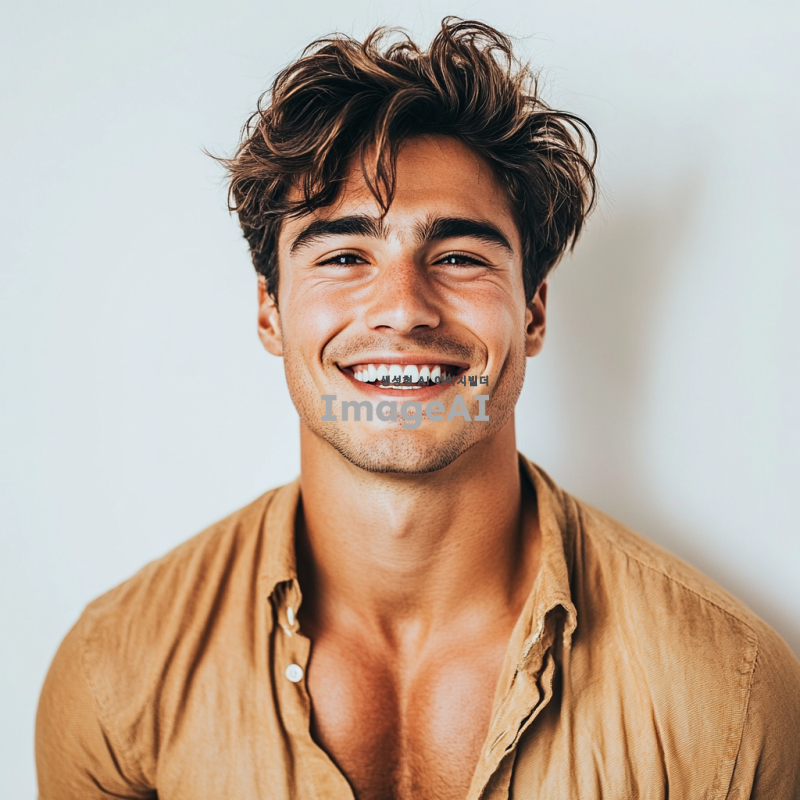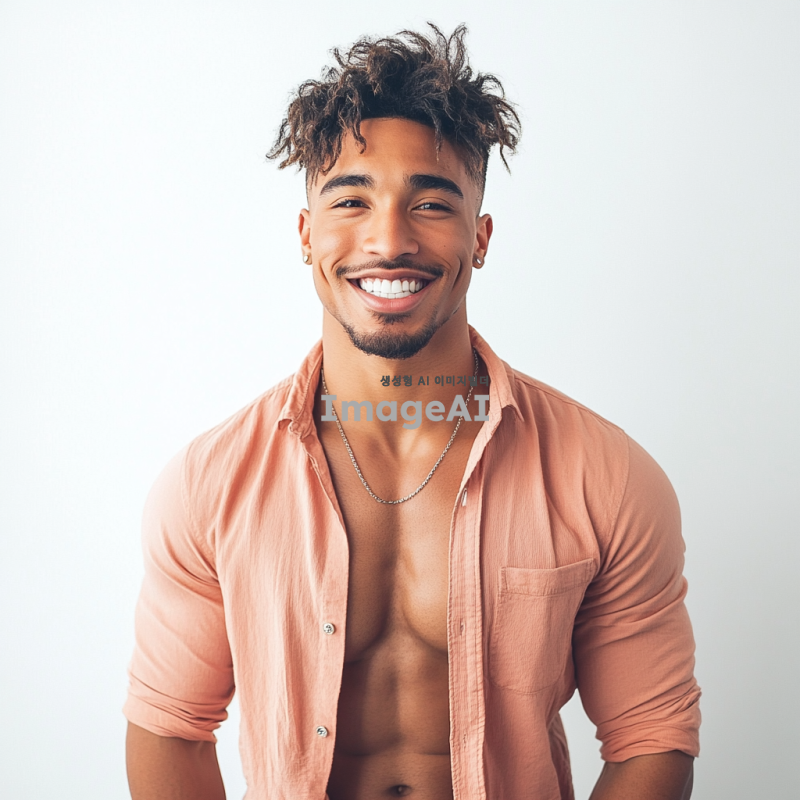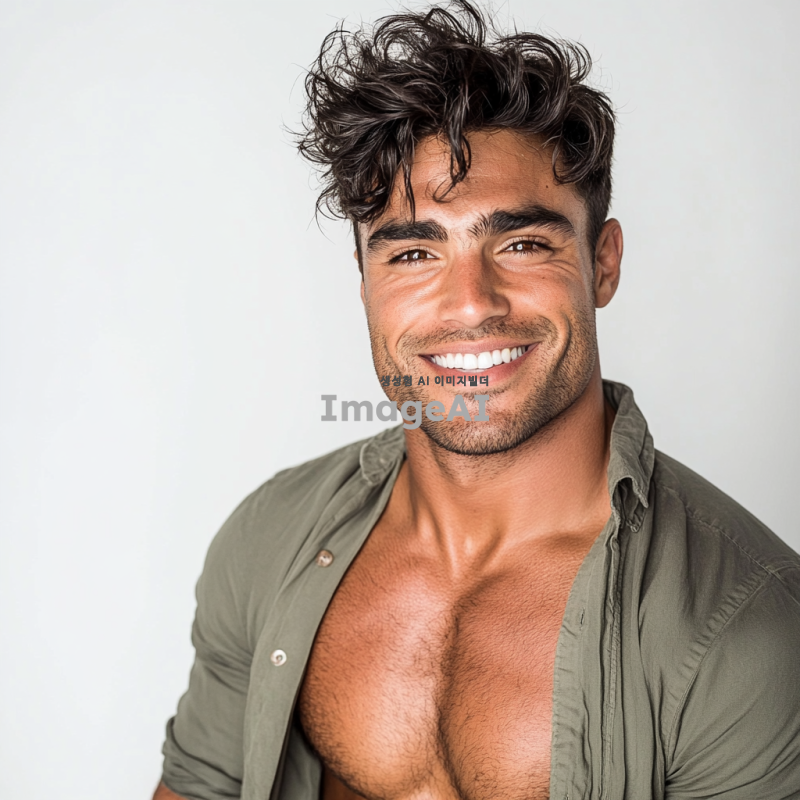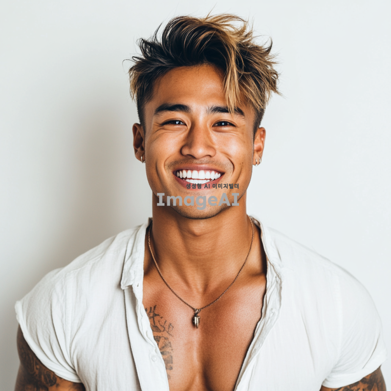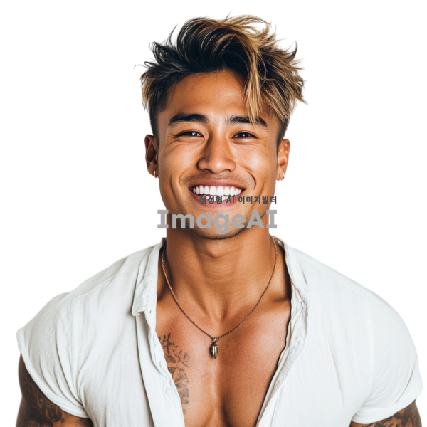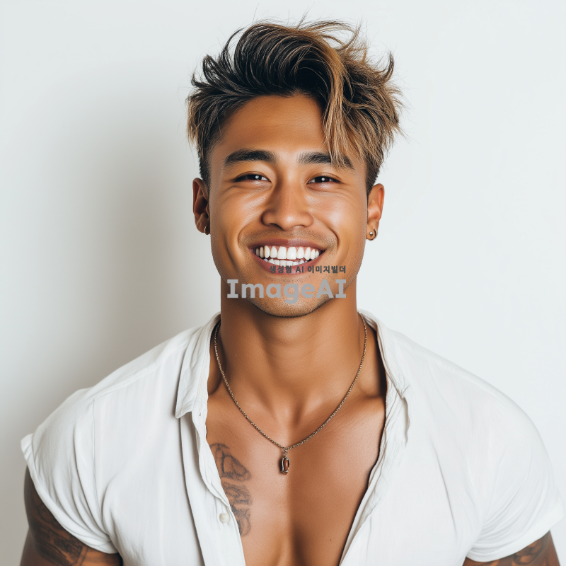 남성미 넘치는 현대적인 남성, 다양한 헤어스타일, 트렌디한 염색 스타일, 패션 잡지 화보 느낌, 밝은 조명 아래에서의 촬영, 미소 짓는 표정, 남방을 가볍게 걸치고 있고 남자의 배에는 선명한 식스팩이 있다, 흰색 배경.