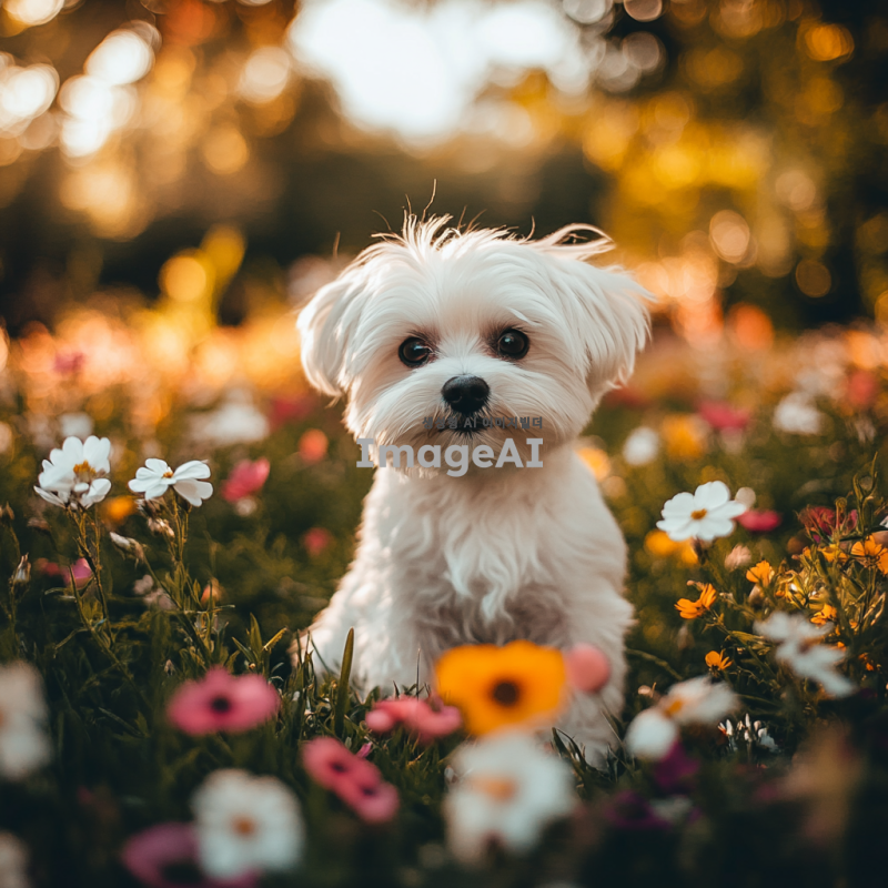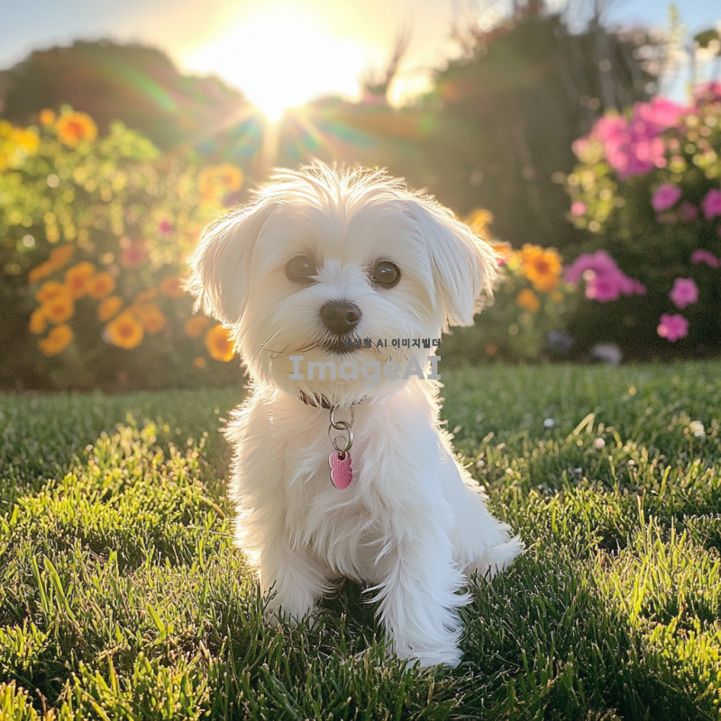따뜻한 햇살 아래에서 풀밭에 앉아 있는 귀여운 말티즈 강아지, 부드럽고 풍성한 하얀 털, 크고 반짝이는 눈, 장난기 가득한 표정, 주변에는 알록달록한 꽃들이 만발해 있는 모습, 평화롭고 포근한 분위기.