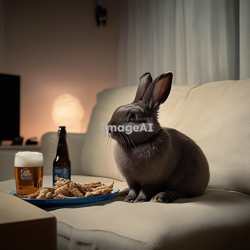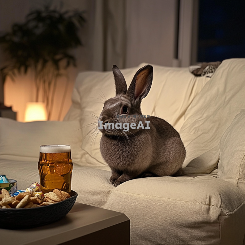 진한 회색 샴토끼가 아이보리색 쇼파에 앉아 영화 감상 중인 모습, 쇼파 테이블에는 맥주와 다양한 안주가 놓여 있는 장면, 아늑하고 편안한 분위기의 거실, 부드러운 조명으로 따뜻한 느낌 강조.
