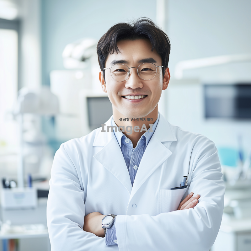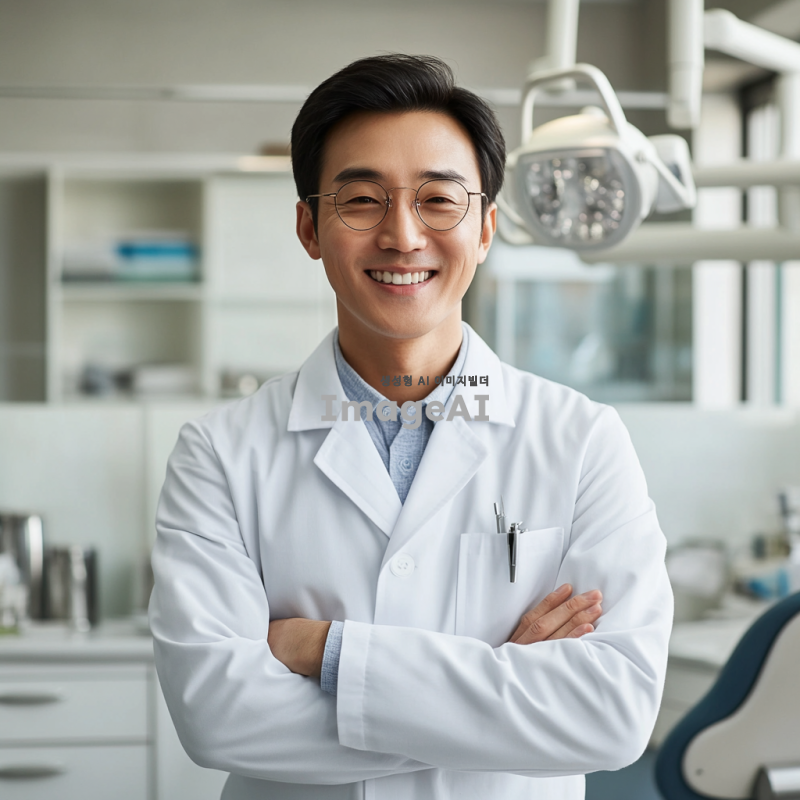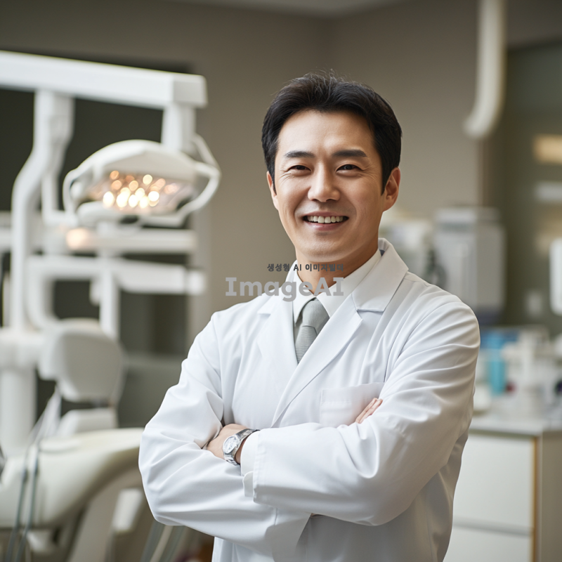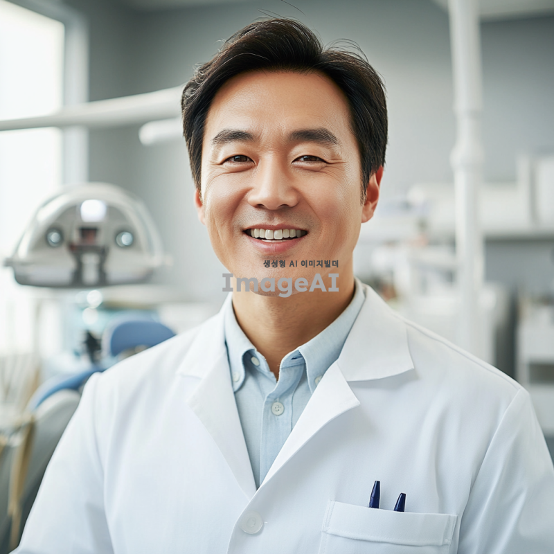 중년 한국인 남성 치과의사, 전문적인 치과 환경, 하얀 치과 가운을 입고 미소를 짓고 있으며, 현대적인 치과 장비와 깨끗한 진료실 배경, 친절하고 신뢰감을 주는 표정, 단정한 헤어스타일과 깔끔한 외모, 차분하고 편안한 분위기.