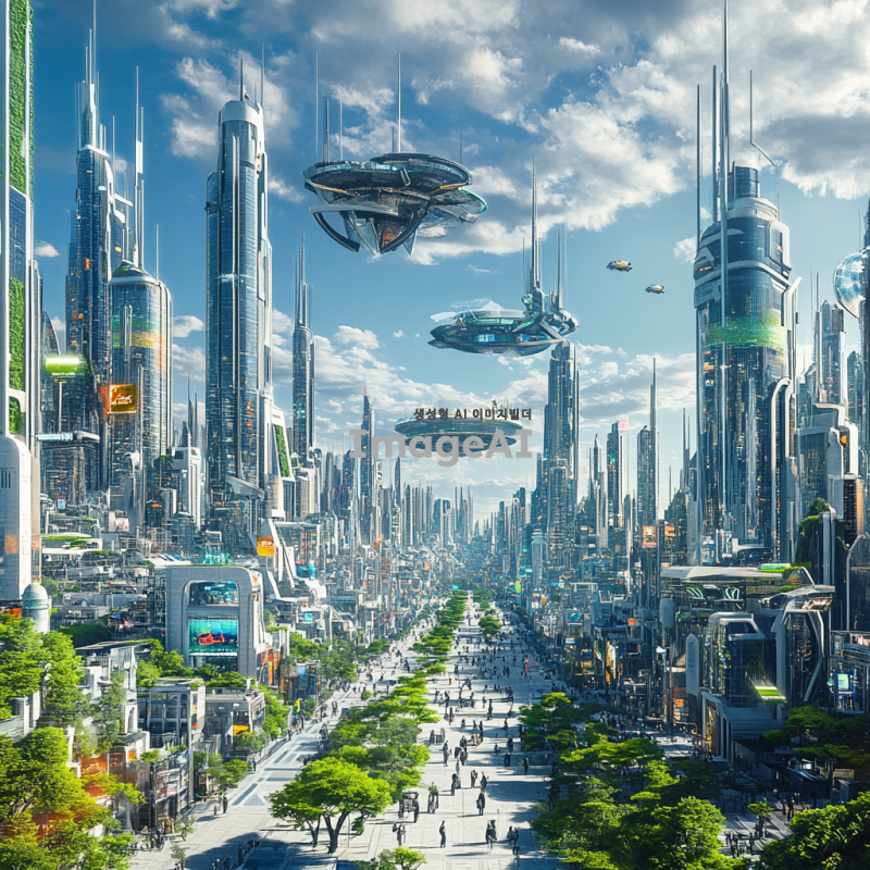 현대적이고 미래지향적인 도시의 전경, 고층 빌딩들이 하늘 높이 솟아 있으며, 다양한 건축 양식이 조화를 이루고 있는 모습, 푸른 하늘과 함께 반짝이는 유리창, 도시의 거리에는 사람들이 활기차게 움직이고 있으며, 녹지 공간과 공공 예술 작품들이 곳곳에 자리잡고 있는 모습, 기술과 자연이 조화를 이루는 도시의 풍경.