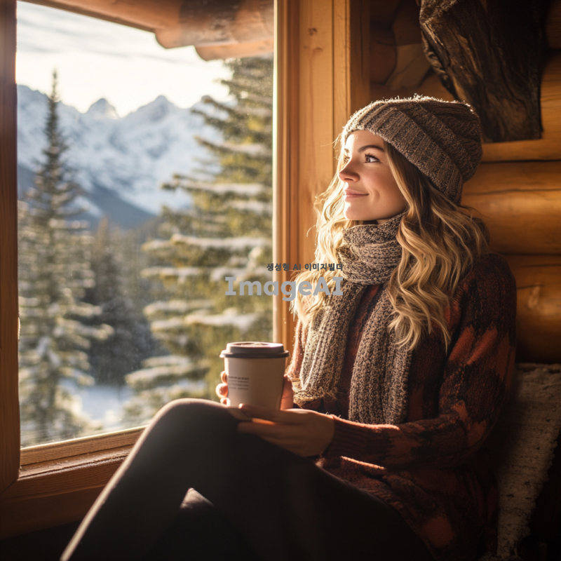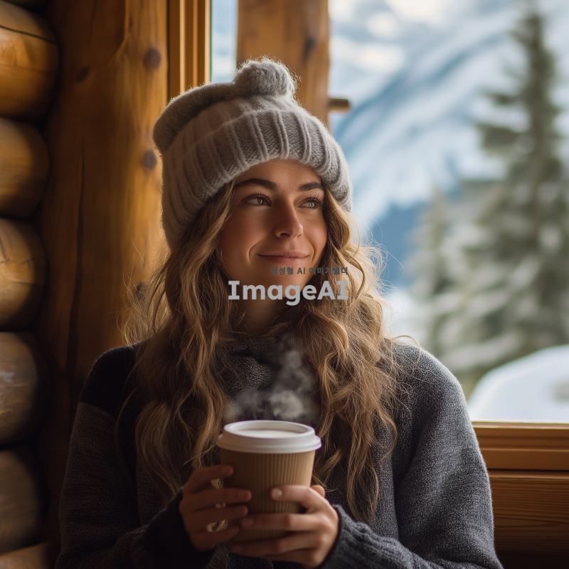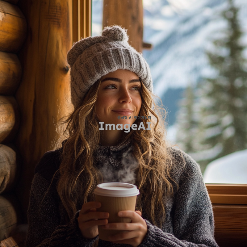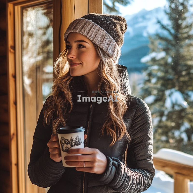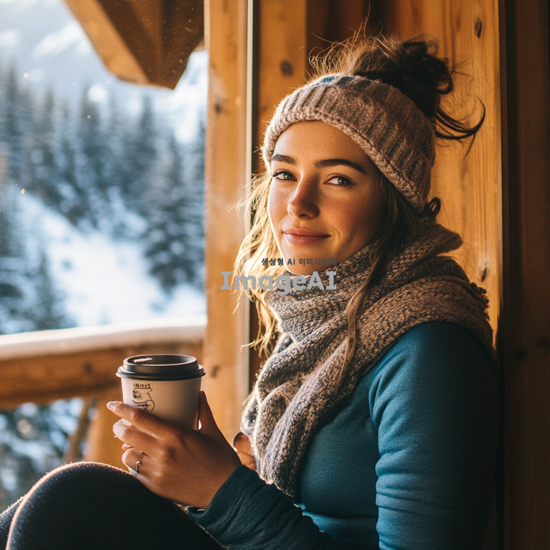 따뜻한 햇살이 비치는 산장 안에서 겨울 등산복을 입고 커피를 마시는 아름다운 20대 여성, 창문 밖으로 보이는 눈 덮인 산과 나무들, 아늑하고 편안한 분위기, 부드럽고 따뜻한 색감, 자연스럽고 편안한 표정과 자세, 겨울철의 따뜻함과 휴식을 느낄 수 있는 장면.