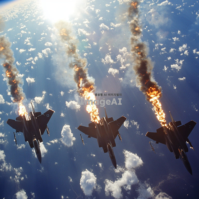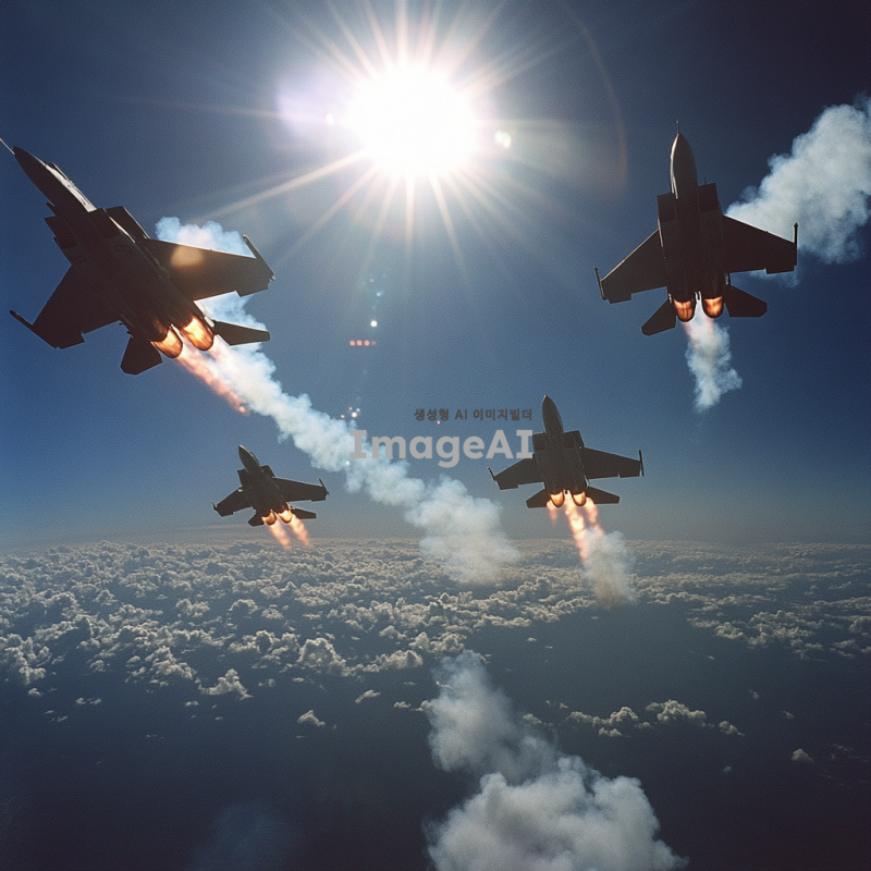 푸른 하늘을 배경으로 다양한 전투기가 공중에서 역동적으로 전투를 벌이는 장면, 전투기들은 최신식 기술을 자랑하며, 빠른 속도로 하늘을 가로지르며 기동하고 있다. 각 전투기는 서로를 향해 다양한 각도에서 공격을 시도하며, 하늘에는 연기와 불꽃이 어우러져 긴장감이 감돈다. 태양빛이 전투기 표면에 반사되어 빛나고, 구름 사이로 전투기의 실루엣이 드러난다. 전체적인 분위기는 긴박하고 스릴 넘치는 전투의 한가운데에 있는 듯한 느낌을 준다.