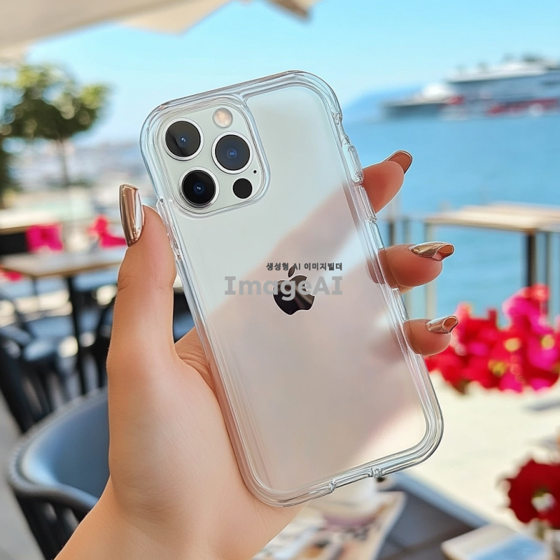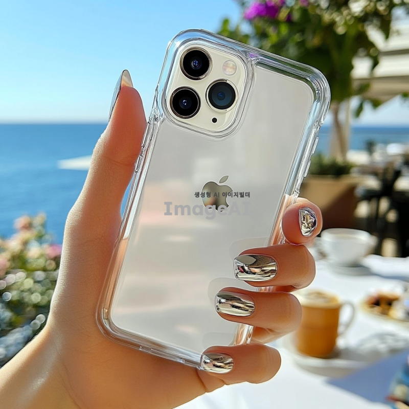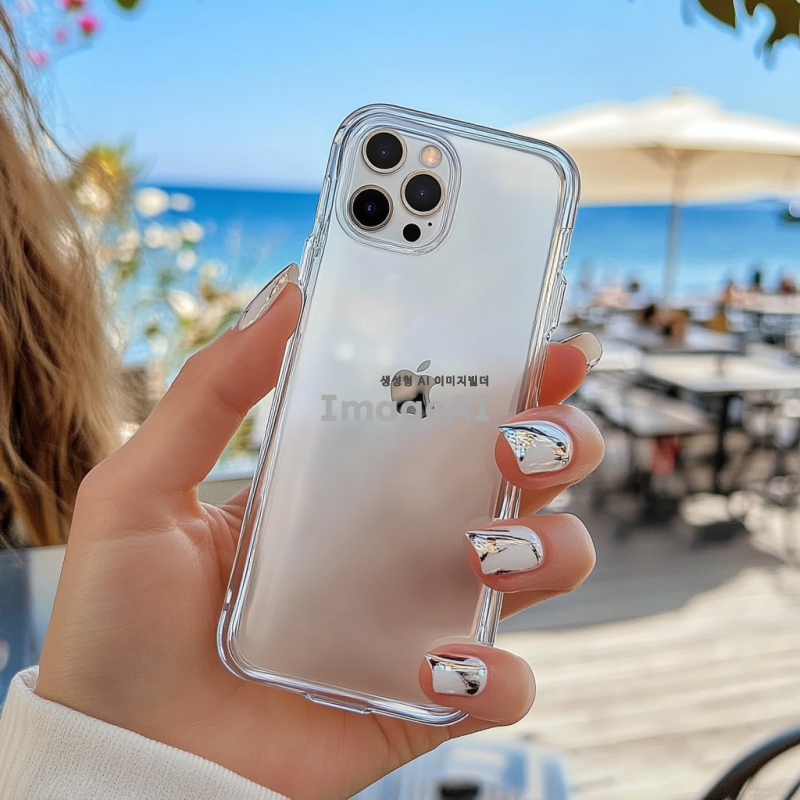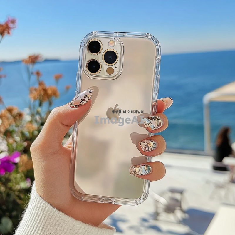 여성의 손에 아이폰에 끼워진 투명 케이스를 들고 있는 모습, 손톱은 세련된 네일아트로 장식되어 있습니다. 배경은 흐릿한 푸른 하늘이나 바다, 또는 아름다운 카페로 설정되어 있습니다.