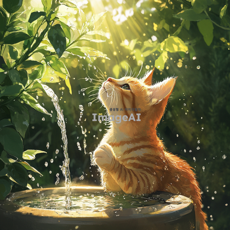 귀여운 고양이가 작은 분수대에서 물을 장난스럽게 툭툭 치며 놀고 있는 장면, 주변에는 초록색 식물들이 있고, 고양이의 털은 햇빛을 받아 반짝이며, 물방울이 공중에서 빛을 반사하는 모습, 배경은 부드러운 자연광으로 가득한 정원.