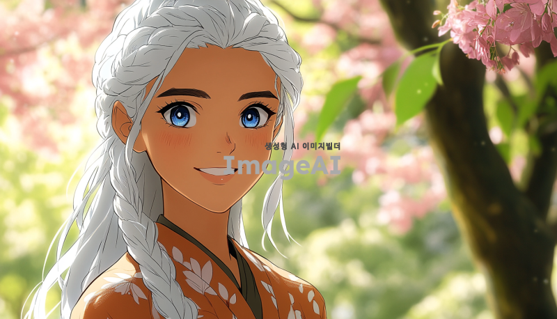 흰색 장발에 푸른 눈을 가진 소녀가 귀살대원복을 입고 희미하게 웃고 있는 모습, 부드러운 조명과 배경은 자연 속에서 조화롭게 어우러진 장면, 섬세한 디테일과 따뜻한 분위기, 애니메이션 스타일.