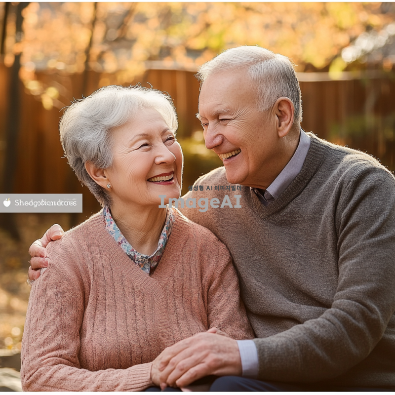 밝고 따뜻한 미소를 짓고 있는 할머니와 할아버지의 초상화, 자연스러운 배경, 부드러운 조명, 따뜻한 색감, 친근하고 행복한 분위기, 주름이 자연스럽게 드러나는 디테일, 건강하고 활기찬 모습, 서로를 바라보며 웃는 장면.