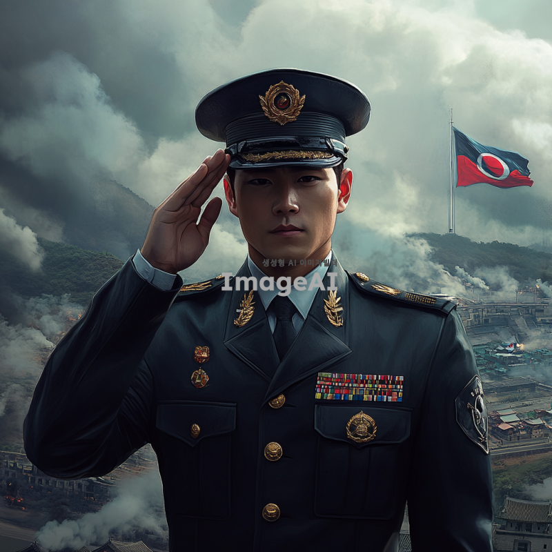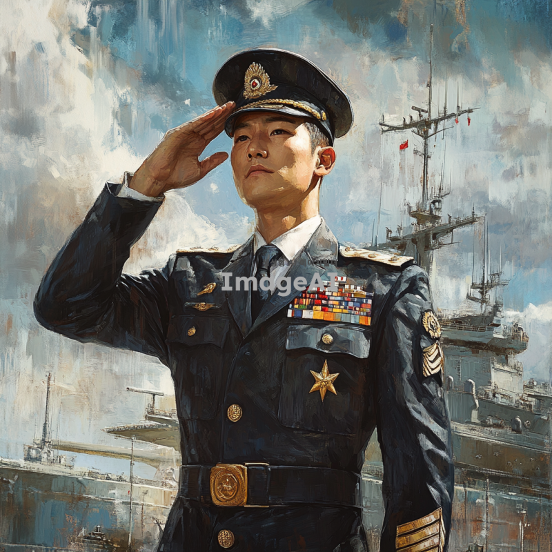 한국 해군 군인이 경례하는 장면, 군복과 모자가 잘 갖춰진 모습, 배경은 한국 해군의 상징적인 장소나 훈련소, 엄숙하고 진지한 분위기, 군인의 자세는 정면을 향해 경례하는 모습, 선명한 디테일과 현실적인 표현, 한국 국기의 색상 요소 포함.