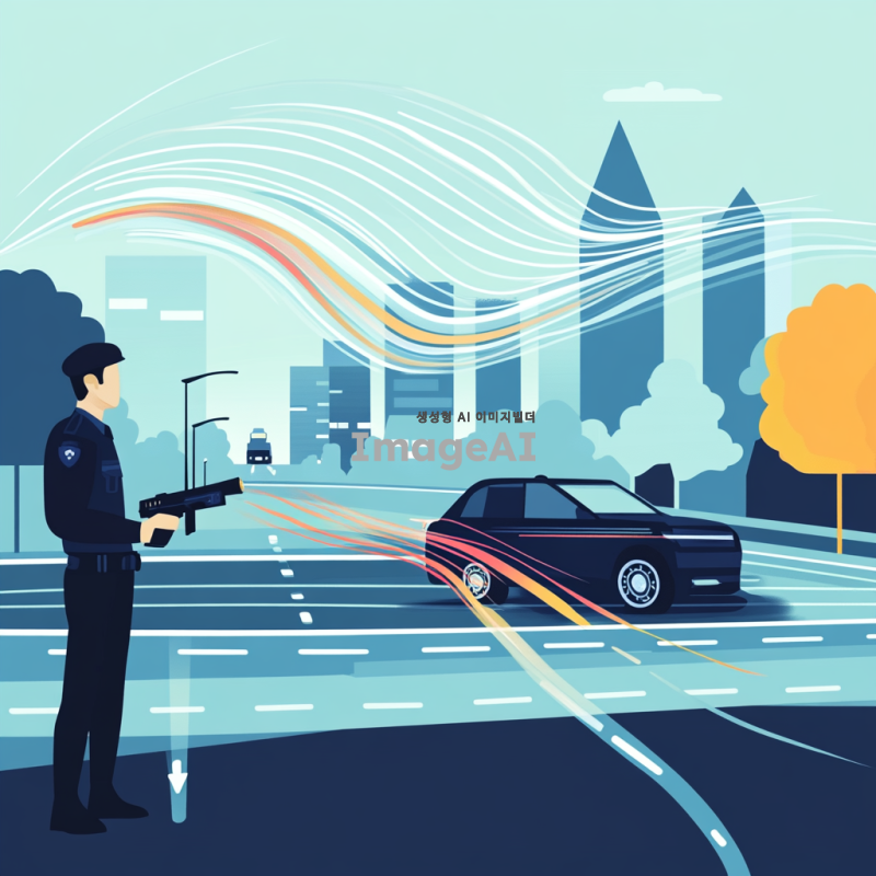 도플러 효과를 설명하기 위한 예시로, 스피드건을 사용하여 도로 위를 빠르게 지나가는 자동차의 속력을 측정하는 장면. 스피드건을 들고 있는 교통 경찰이 도로 옆에 서 있으며, 자동차는 고속으로 주행 중. 자동차 주변에 속도감과 도플러 효과를 상징하는 파동이나 선이 시각적으로 표현되어 있음. 배경은 도시의 도로로, 현대적인 건물과 나무들이 보임. 날씨는 맑고 햇빛이 밝게 비추고 있어 생동감 있는 장면.