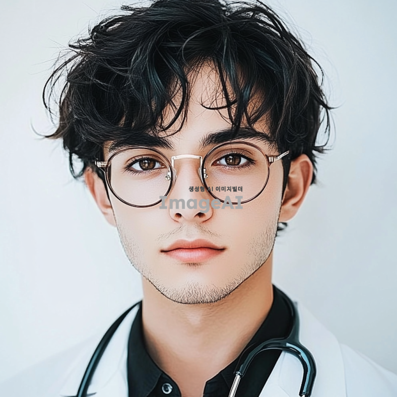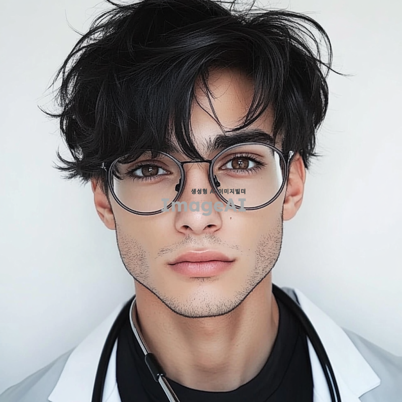 연갈색 눈동자와 검은 머리카락을 가진 젊은 남성 미소년, 약간 측면 각도로 얼굴을 중심으로 하얀 배경 위에 서 있는 모습. 안경을 착용하고 있으며 목에 청진기를 두르고 있는 의사.