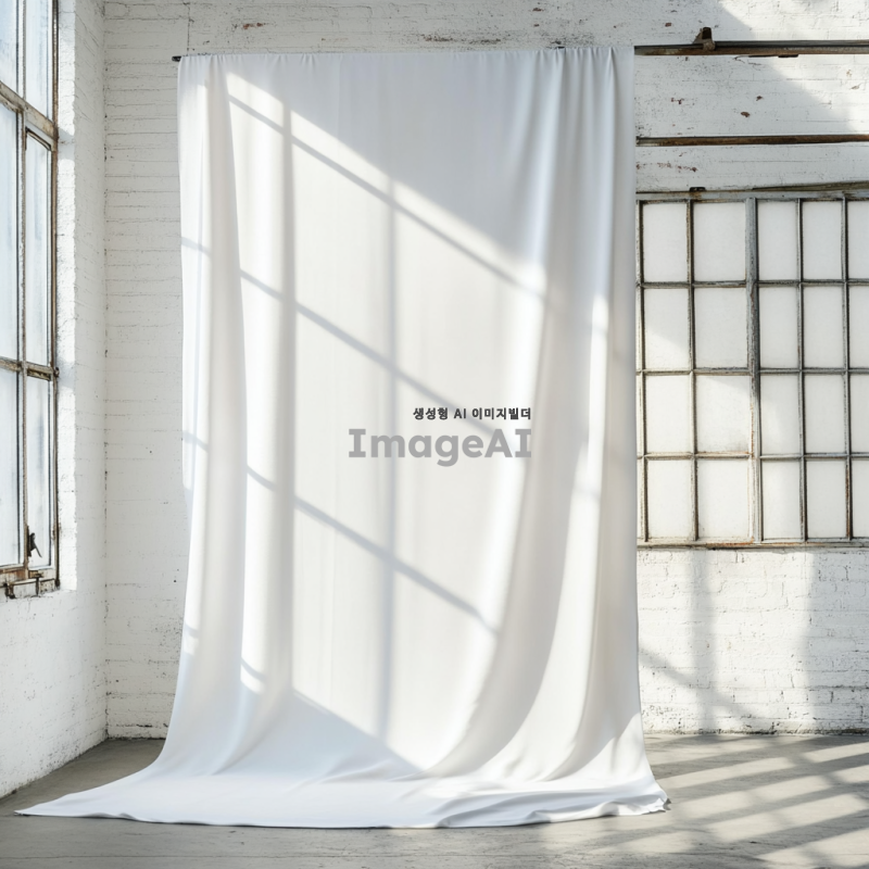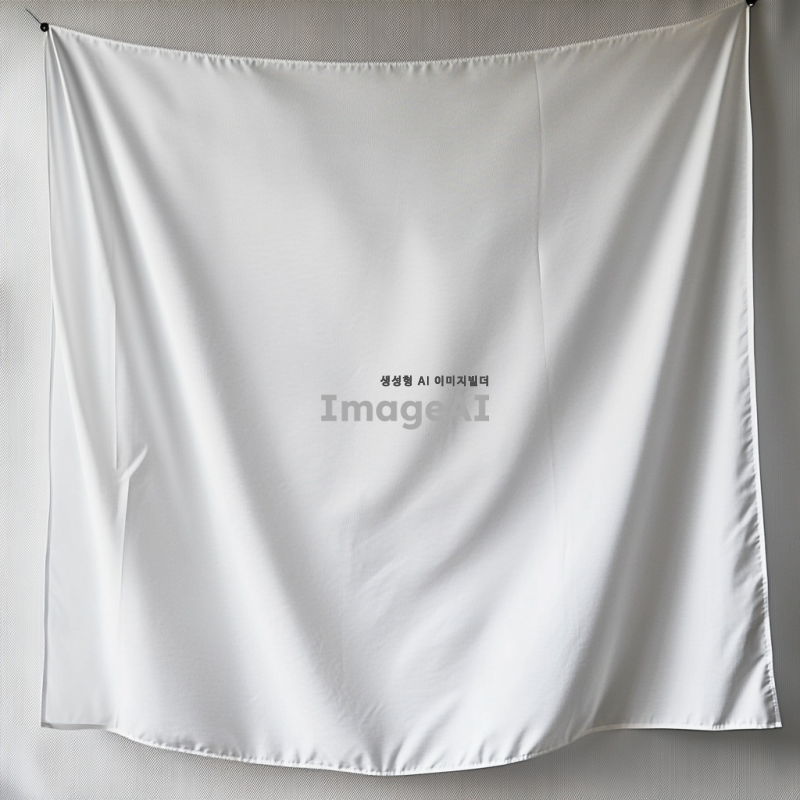 실내에 깨끗한 하얀 현수막 천. 사방에 타공 아일렛이 큼지막하게 박혀있다. 주름없이 팽팽하게.
