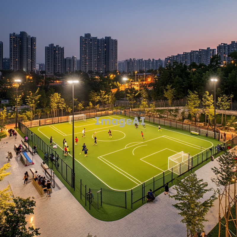 현대적인 풋살 경기장, 인조 잔디, 조명 시스템, 관중석, 주변에 나무와 녹지가 어우러진 환경, 활기찬 분위기, 다양한 연령대의 사람들이 경기를 즐기는 모습, 가족과 친구들이 함께 응원하는 장면, 안전하고 편안한 시설, 친환경적인 디자인 요소, 도시 속의 스포츠 오아시스.