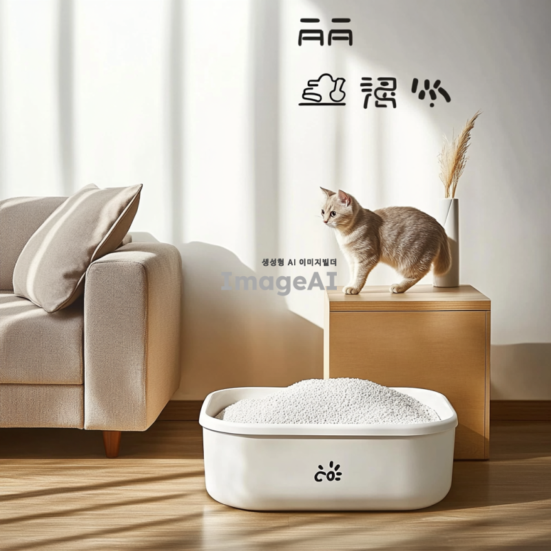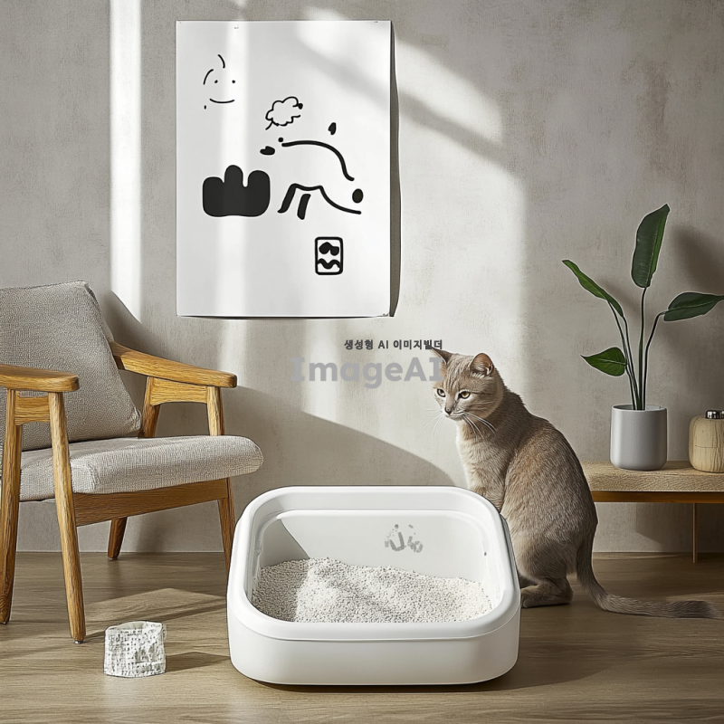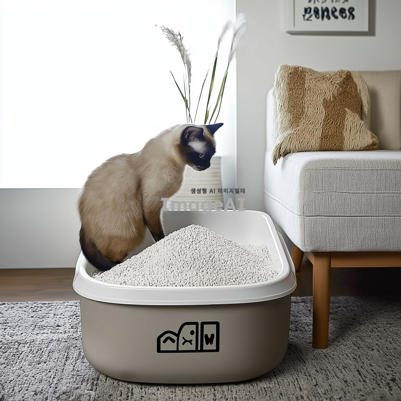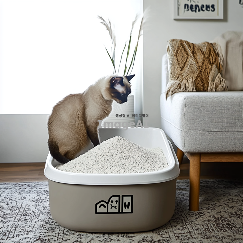 화이트 실리카겔과 벤토나이트가 섞인 고양이모래에 고양이가 화장실을 보고 있고, 깔끔한 인테리어의 거실에 있는 모습