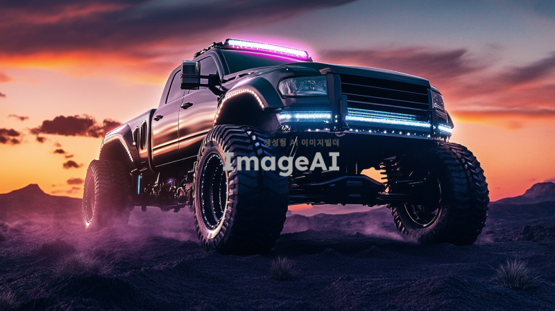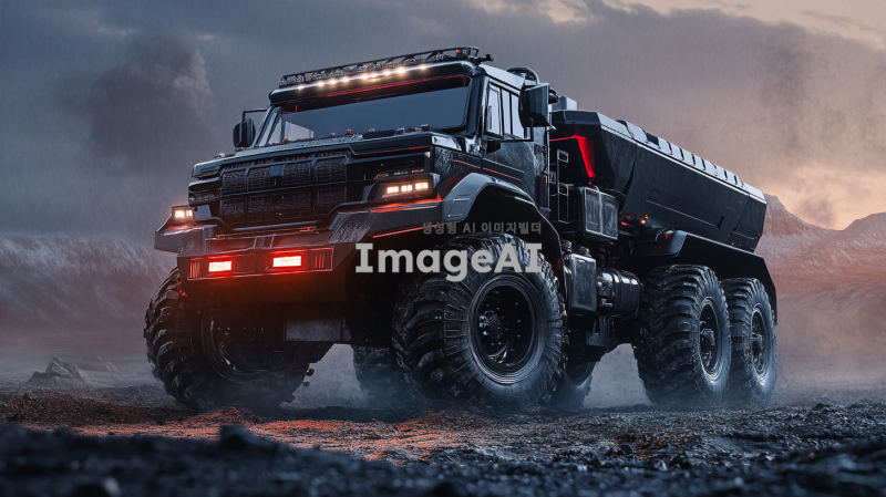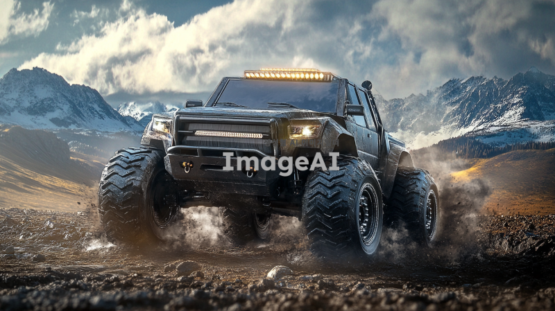강력한 엔진 소리를 내며 거친 지형을 달리는 힘찬 트럭, 커다란 바퀴와 견고한 차체, 강력한 헤드라이트가 어두운 길을 밝히고 있는 모습, 현대적이고 날렵한 디자인, 강렬한 색상과 메탈릭한 질감, 트럭의 웅장함과 힘을 강조하는 역동적인 각도.
