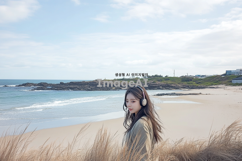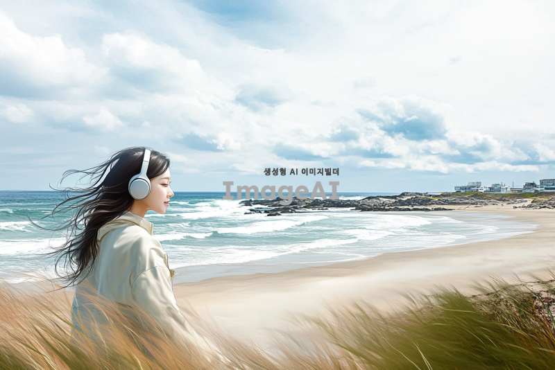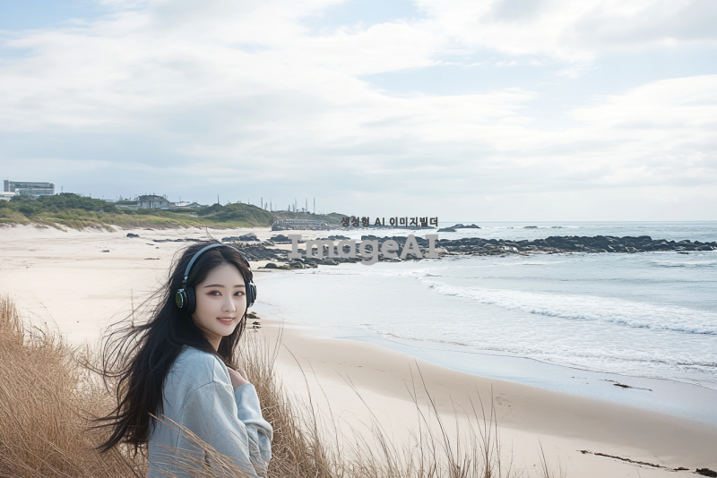 20대 아름다운 한국 여성이 헤드폰을 착용하고 바닷가를 거닐고 있는 장면, 맑은 하늘과 잔잔한 파도가 배경으로 어우러져 있으며, 여인은 편안하고 행복한 표정을 짓고 있다. 그녀의 긴 머리카락이 바람에 살짝 흩날리고 있으며, 캐주얼한 가을 옷차림을 하고 있다. 자연스럽고 사실적인 색감으로 표현된 장면.