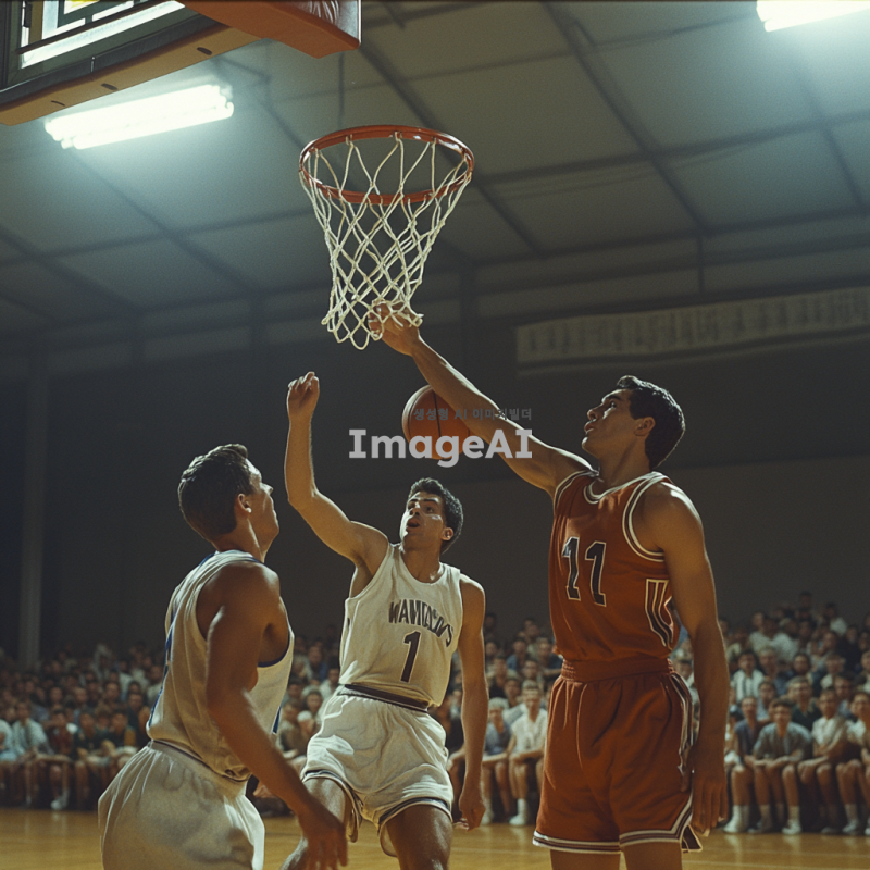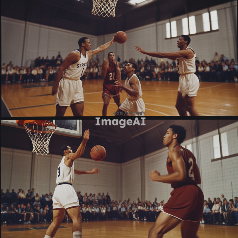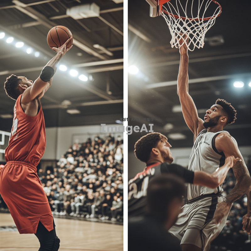 1. 첫 번째 이미지: 체육관 안에서 농구 시합이 진행 중인 장면. 한 선수가 농구공을 들고 레이업을 시도하고 있으며, 다른 선수는 수비 자세를 취하고 있다. 선수들의 표정은 집중되어 있고, 배경에는 관중들이 응원하고 있는 모습이 보인다.