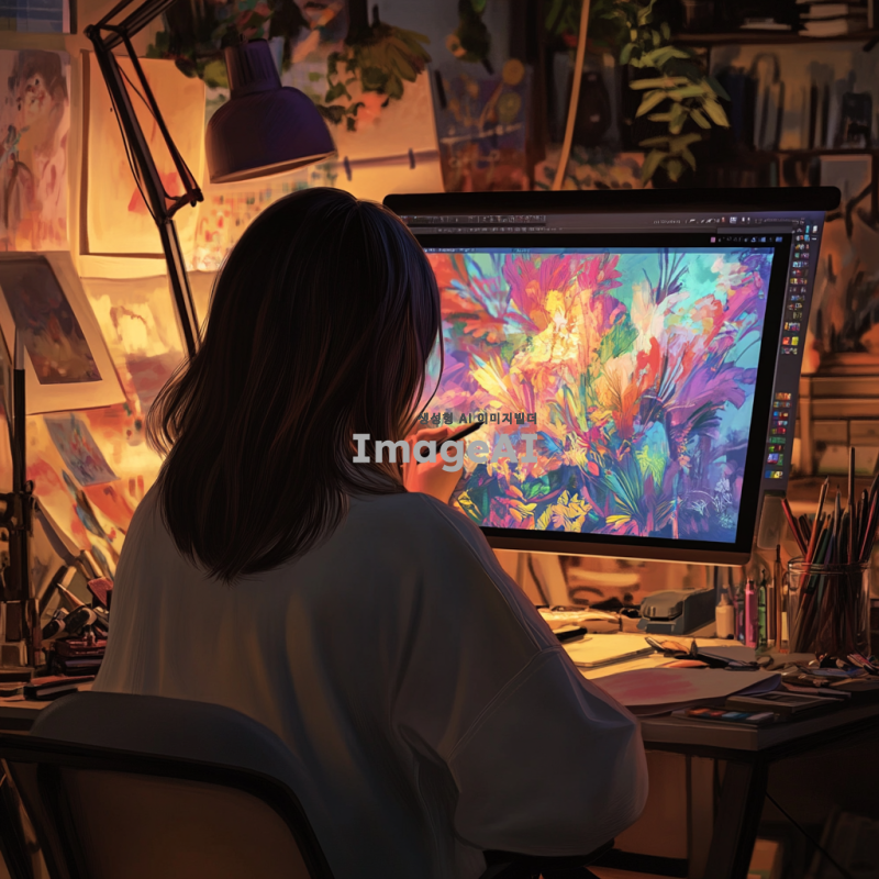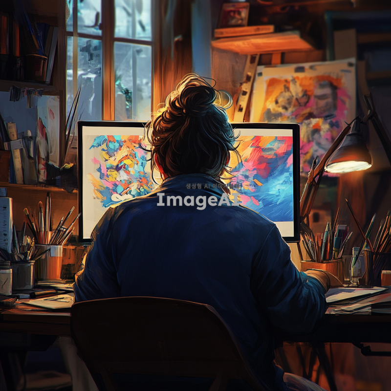 디지털 아트 스튜디오에서 타블렛으로 그림을 그리고 있는 작업자의 뒷모습, 조명은 따뜻하고 부드러운 분위기를 연출하며, 작업자는 편안한 자세로 앉아 있으며, 주변에는 다양한 예술 도구와 참고 자료가 흩어져 있는 장면. 작업자의 머리카락은 자연스럽게 흘러내리고, 작업 중인 화면에는 생동감 있는 색채의 예술 작품이 부분적으로 보인다.